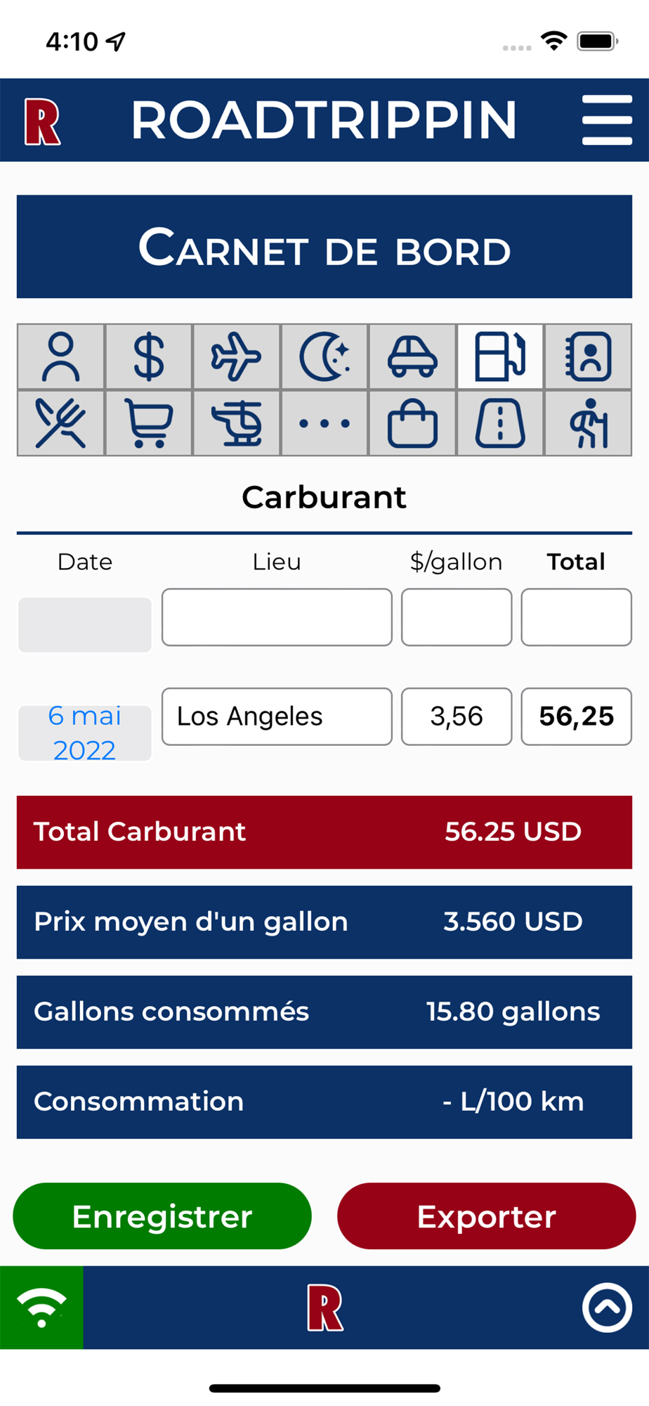Un carnet de bord, dans lequel vous pouvez enregistrer vos achats et dépenses quotidiennes : carburant, restaurants, shopping..., ainsi que les distances parcourues à pied et en voiture.
