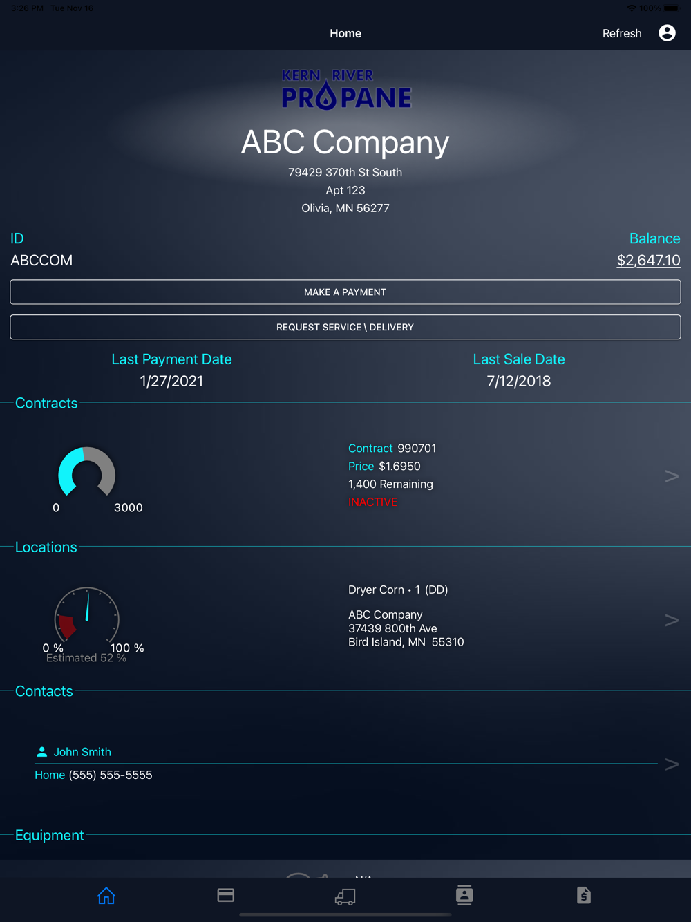 Information at your fingertips! This app gives you direct access to your account balance, location and contract information. It also gives you the ability to store and process payment and request service work and deliveries directly through the app.