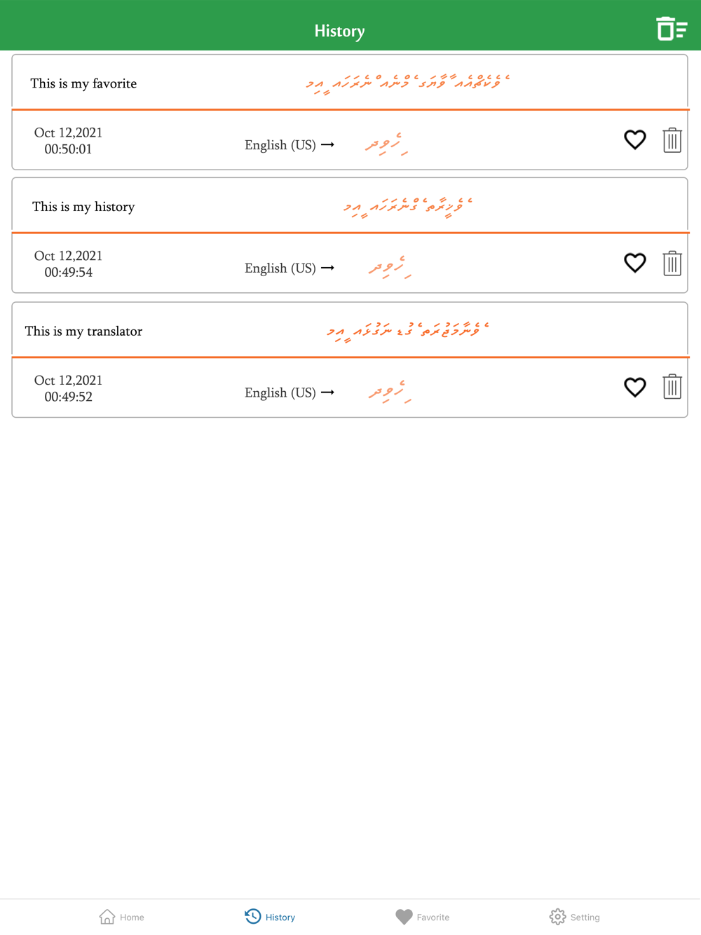 * Dhivehi To English Translator And English To Dhivehi Translation is a must have app for any traveler around the world. you will have access to the best languages packs and voice recognition in the world within your device that you can carry anywhere you go. this language app is designed for many purposes in mind including: everyday conversation, traffic signs, maps, local news, business languages, academic papers, and so on. with just a few taps on your device you will be able to understand most written and spoken words in the language you are not familiar with. it will greatly assist you in communicating with the locals.