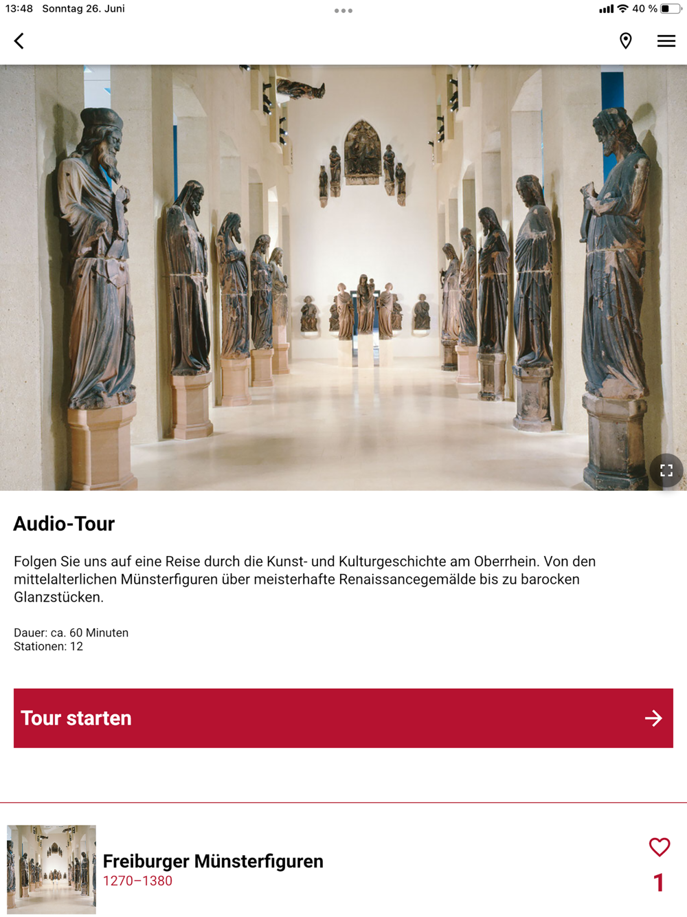 Entdecken Sie das Augustinermuseum: Je nach eigenen Interessen und verfügbarer Zeit gibt es die passende Tour für Sie! Mit der geführten Audio-Thementour „Mittelalter und Barock“ geht es auf eine Reise durch die Kunst- und Kulturgeschichte am Oberrhein – diese ist auch auf Englisch und Französisch verfügbar. Ob in Gebärdensprache, leichter Sprache oder Audiodeskription – in der App gibt es zahlreiche inklusive Angebote. Wer lieber der Nase nach durchs Museum flaniert, kann die App nutzen, um Neues zu entdecken und sich Werke in der Nähe anzeigen lassen. Zur Technik, Restaurierungsgeschichte, zum Leben des Künstlers oder zur Kunst- und Kulturgeschichte des Werks – unterschiedliche Fokusse vertiefen und bereichern das Museumserlebnis. Junge Museumsfans im Alter von 8 bis 12 Jahren können sich mit August und Tina auf eine spannende Tour zu den Highlights begeben und dabei spielerisch Wissen und Geschick unter Beweis stellen.