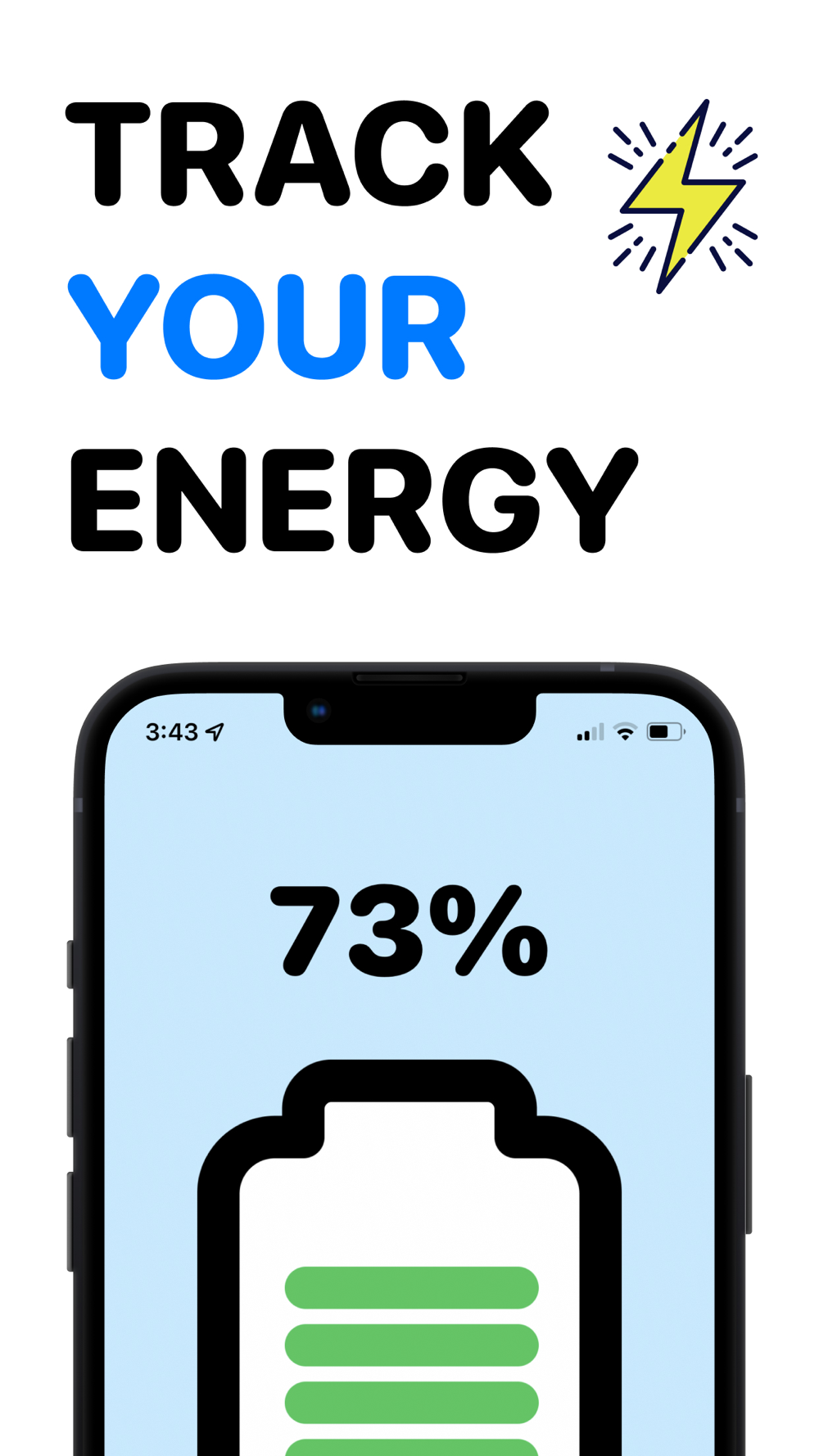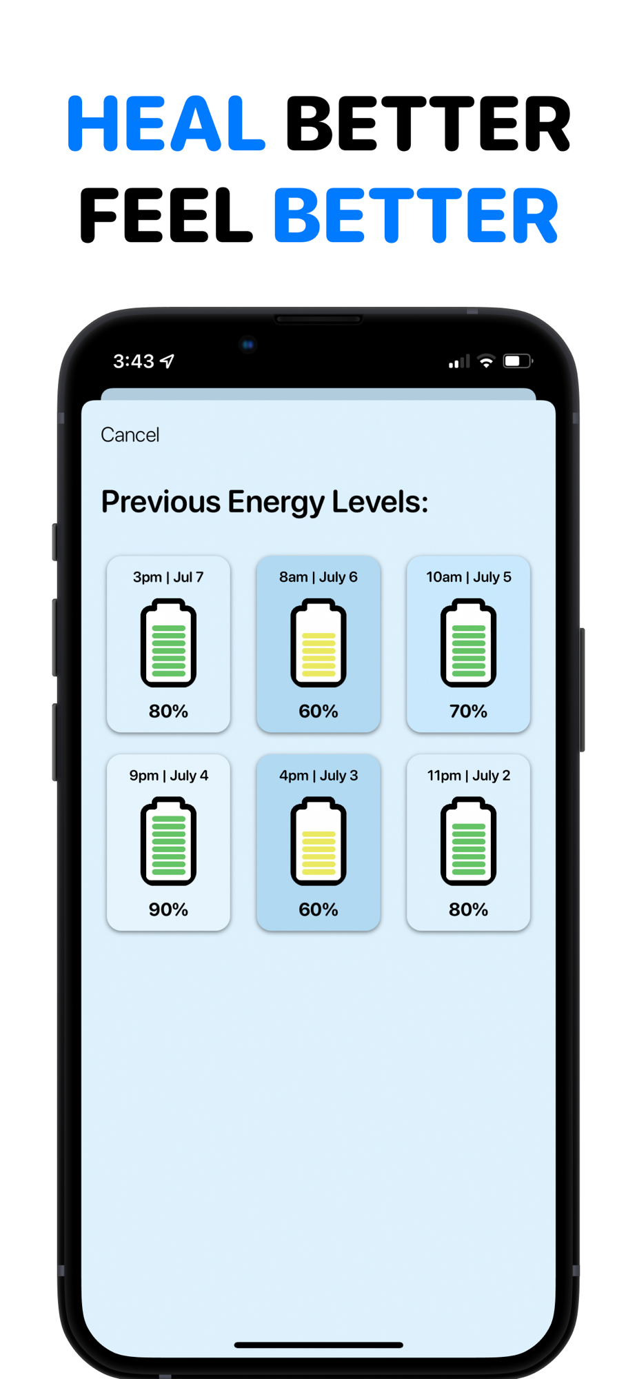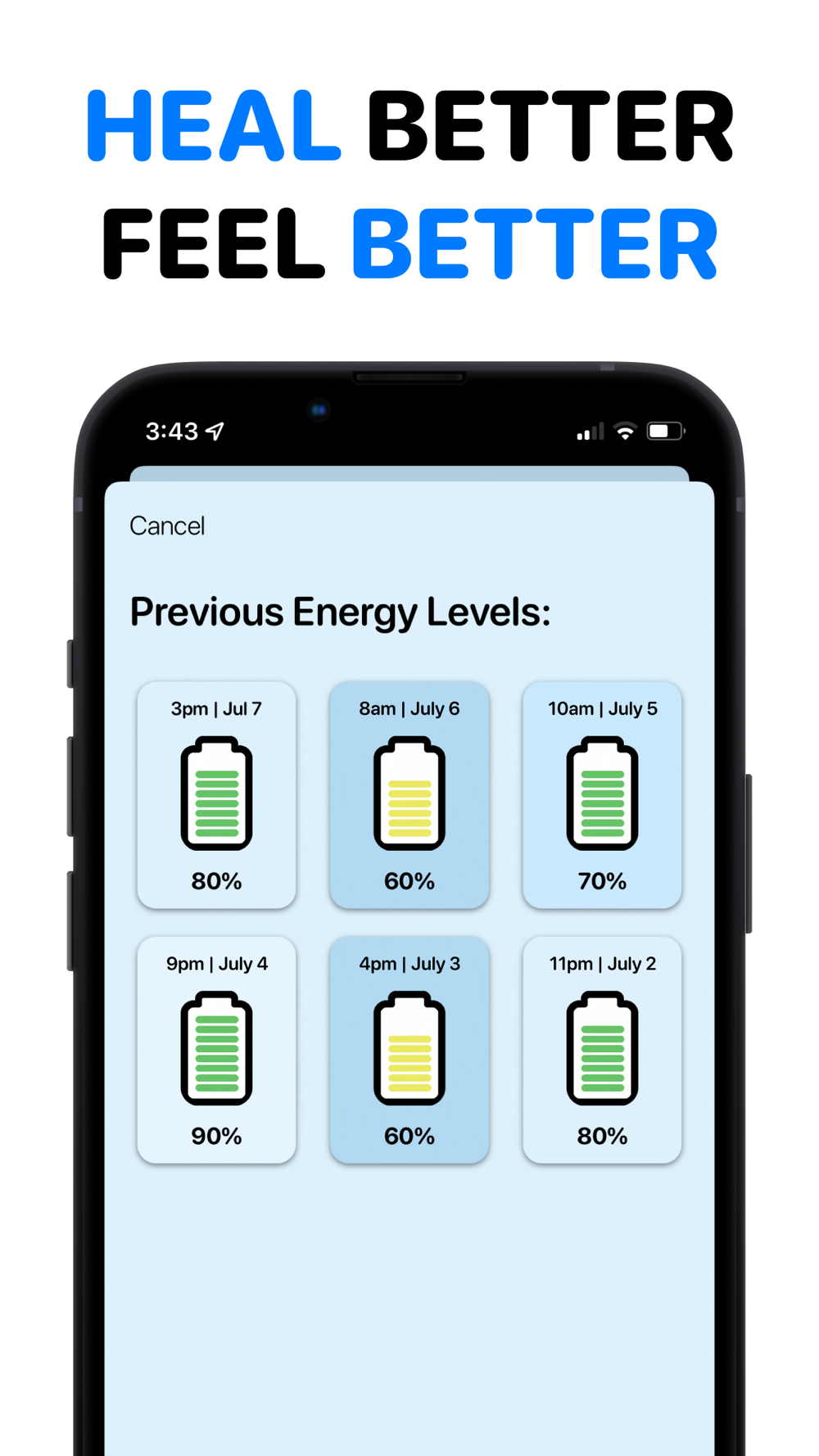 Visually see your own energy level in the form of the common phone battery. Use this new style of self awareness, which will lead to better incorporations of proper self care.