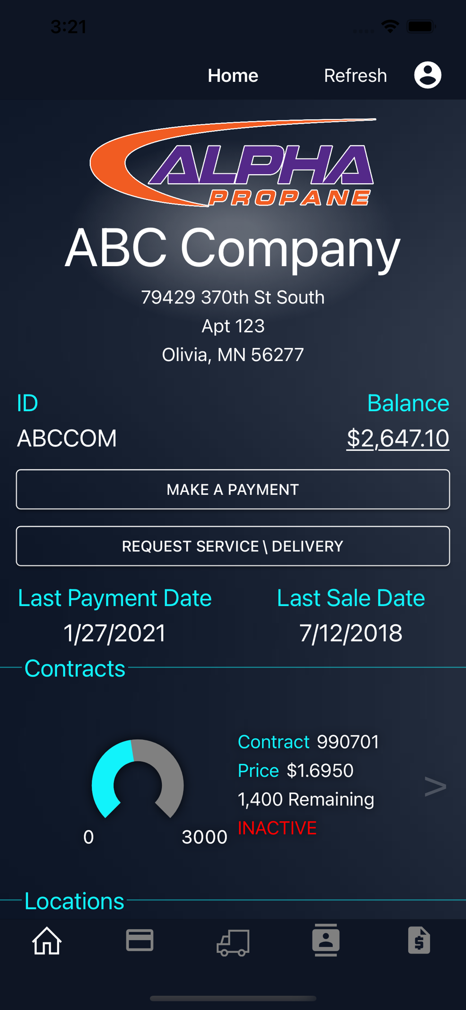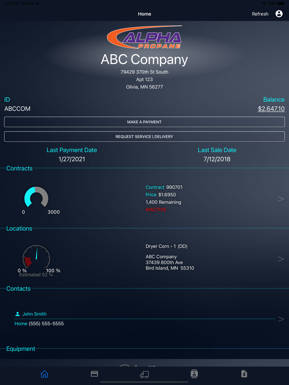 Information at your fingertips! This app gives you direct access to your account balance, location and contract information. It also gives you the ability to store and process payment and request service work and deliveries directly through the app.