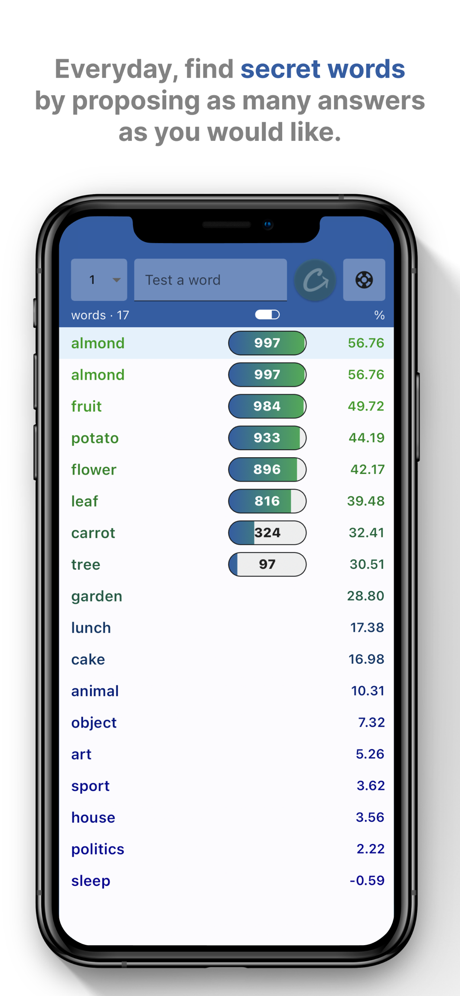 Everyday, find secret words before time runs out. To do so, propose as many answers as you would like: each word gets scored on a scale from -100% to 100% based on how close to the secret word it is. Find a secret word by figuring out what your best words have in common.