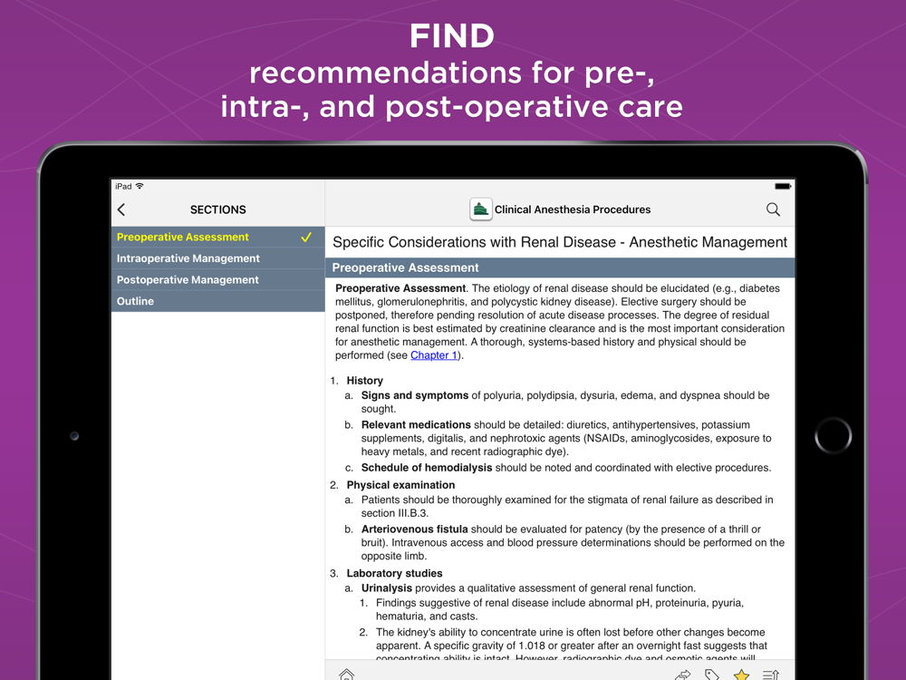 Anesthesia Central is a must-have resource for every anesthesiologist, critical care specialist, nurse anesthetist, and trainee. Consult the automatically updating collection of disease, drug, test, and procedure information for treating patients before, during, and after surgery. Download to your mobile device and use the quick-read format to find answers fast or search for journal articles and citations in the full PubMed database – anytime, anywhere.
