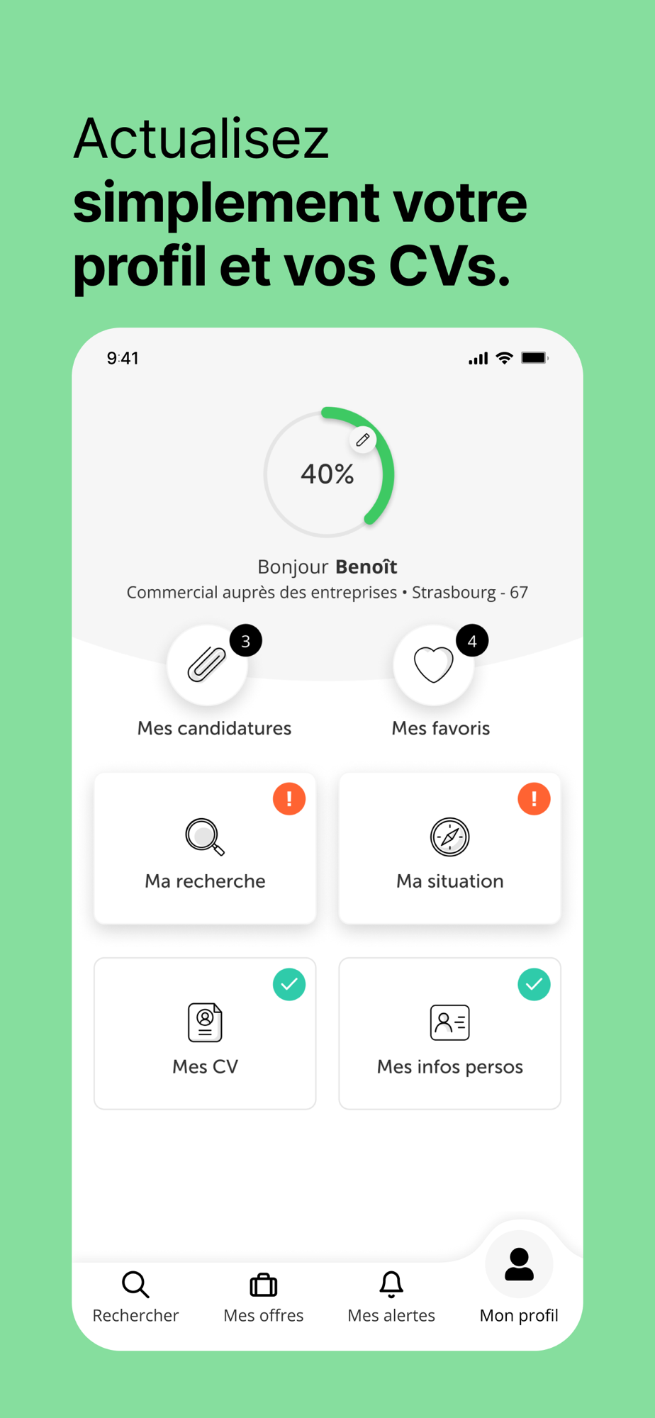 · SUIVRE MES CANDIDATURES : Votre application est synchronisée en live avec le site. Suivez en toute transparence vos candidatures et les réponses des recruteurs partout, à tout moment.