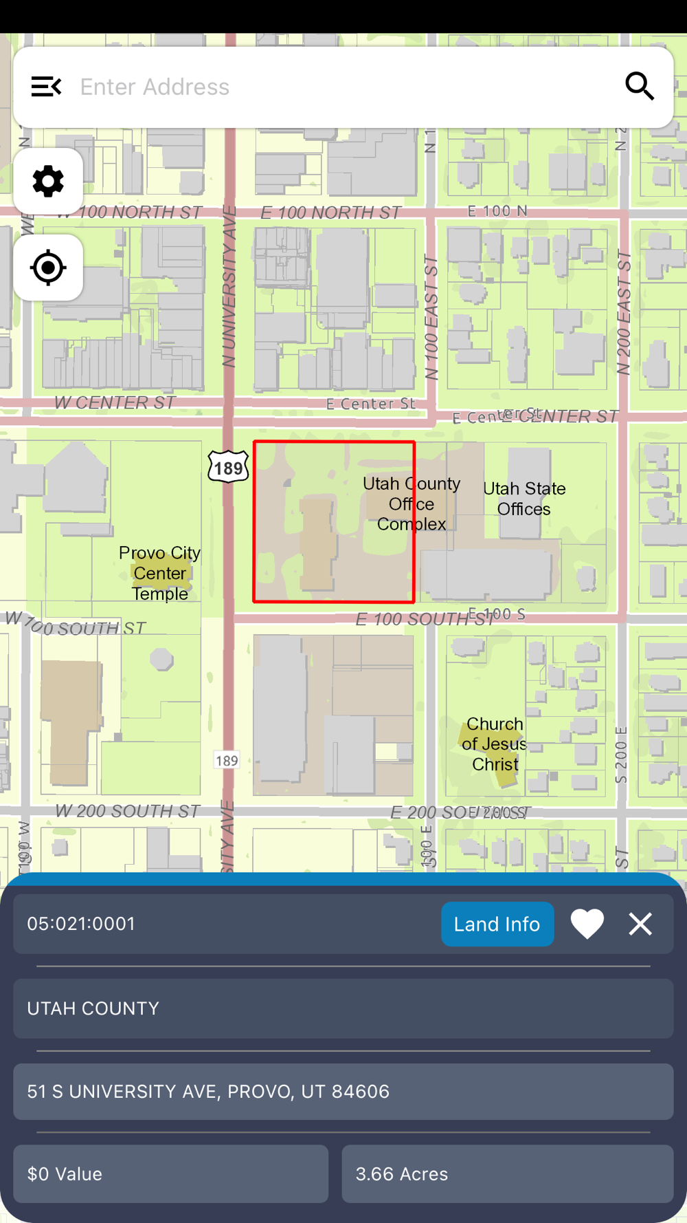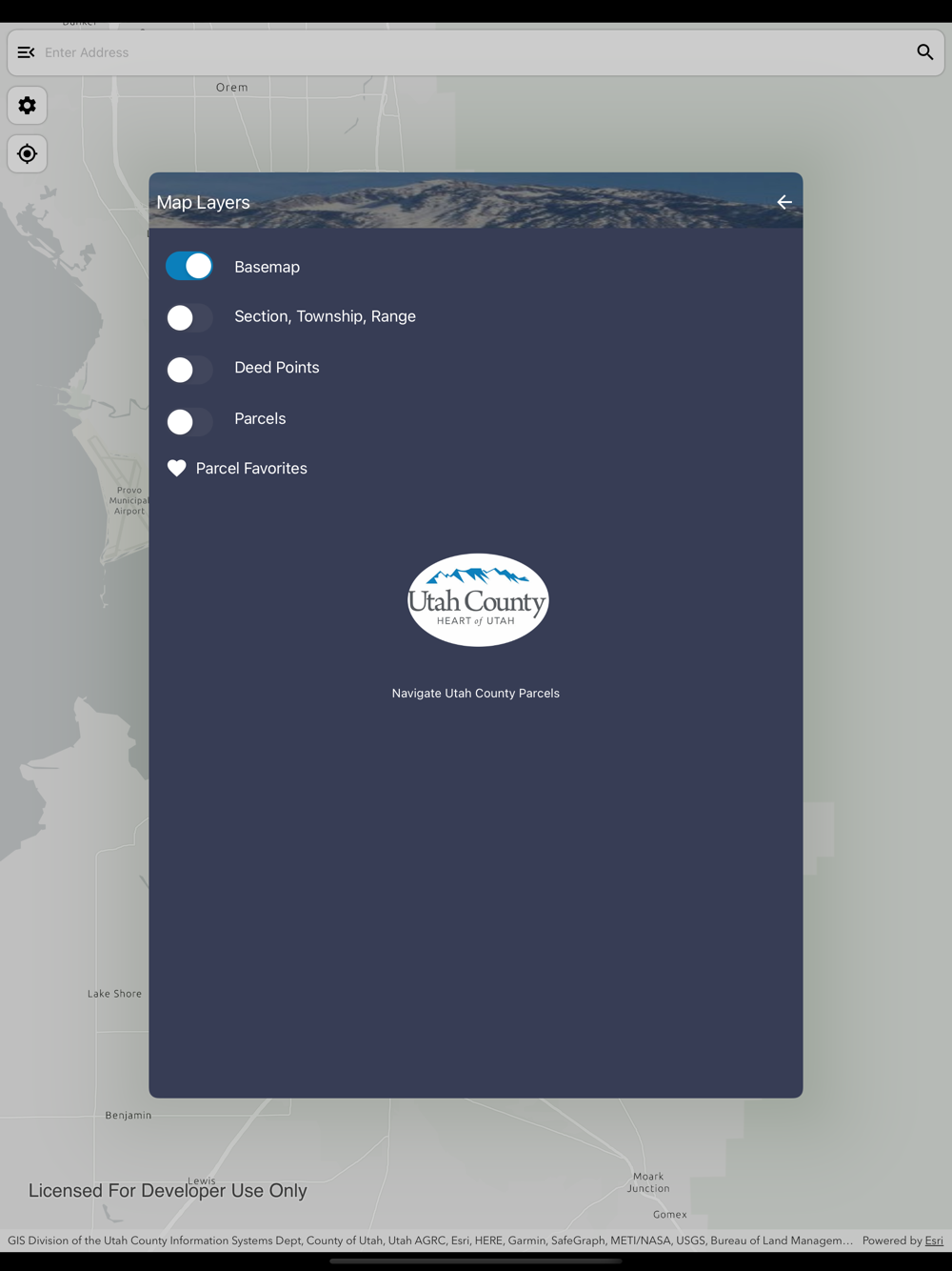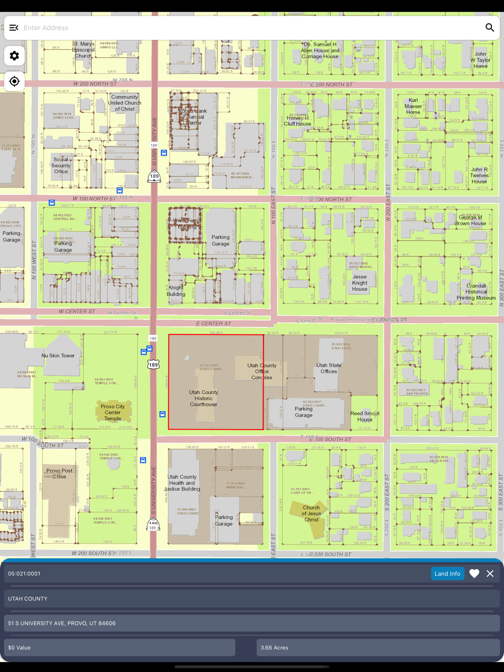 Utah Co Maps enables users to search property records by address, name, parcel, city or by panning and zooming around a beautiful topographic map of Utah County. Once a parcel is selected by tapping on the screen, users can access detailed property information including ownership history, property values, improvement information, and more.