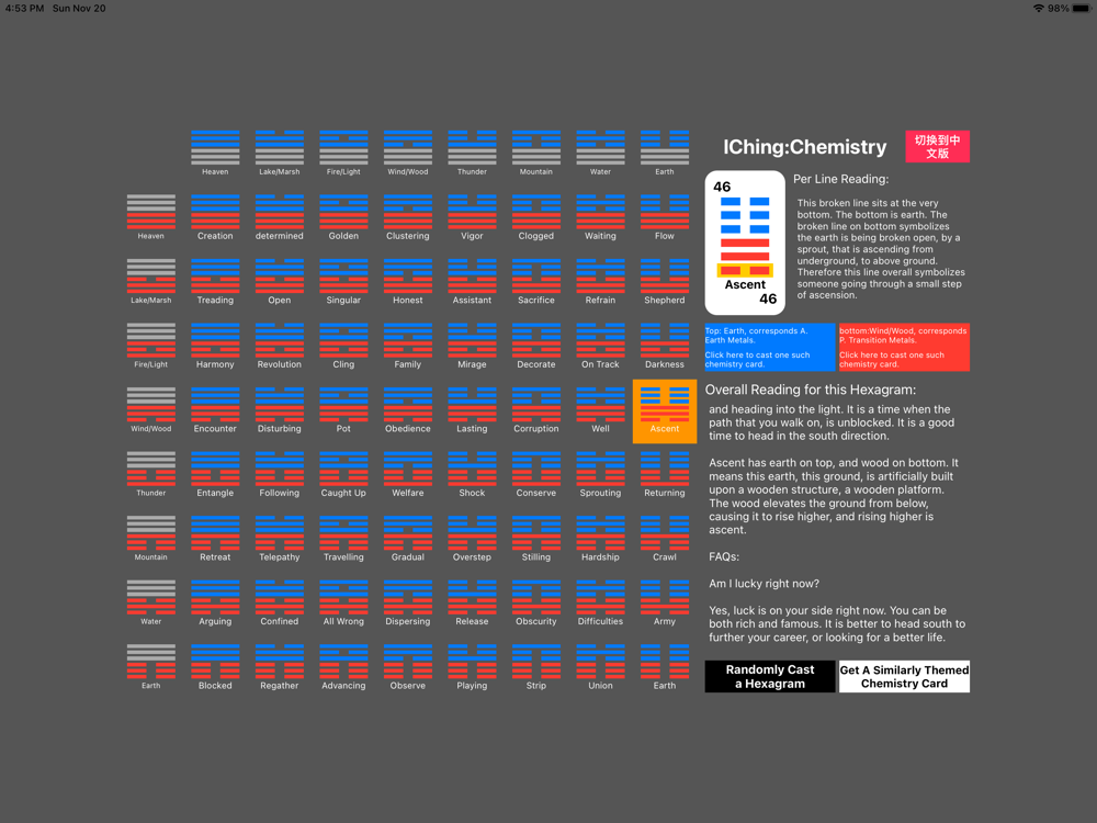 -For each IChing Tarot Card casted, you also get 3 related chemistry element tarot cards, allow you to read your current situations from additional angles, therefore much more detail.