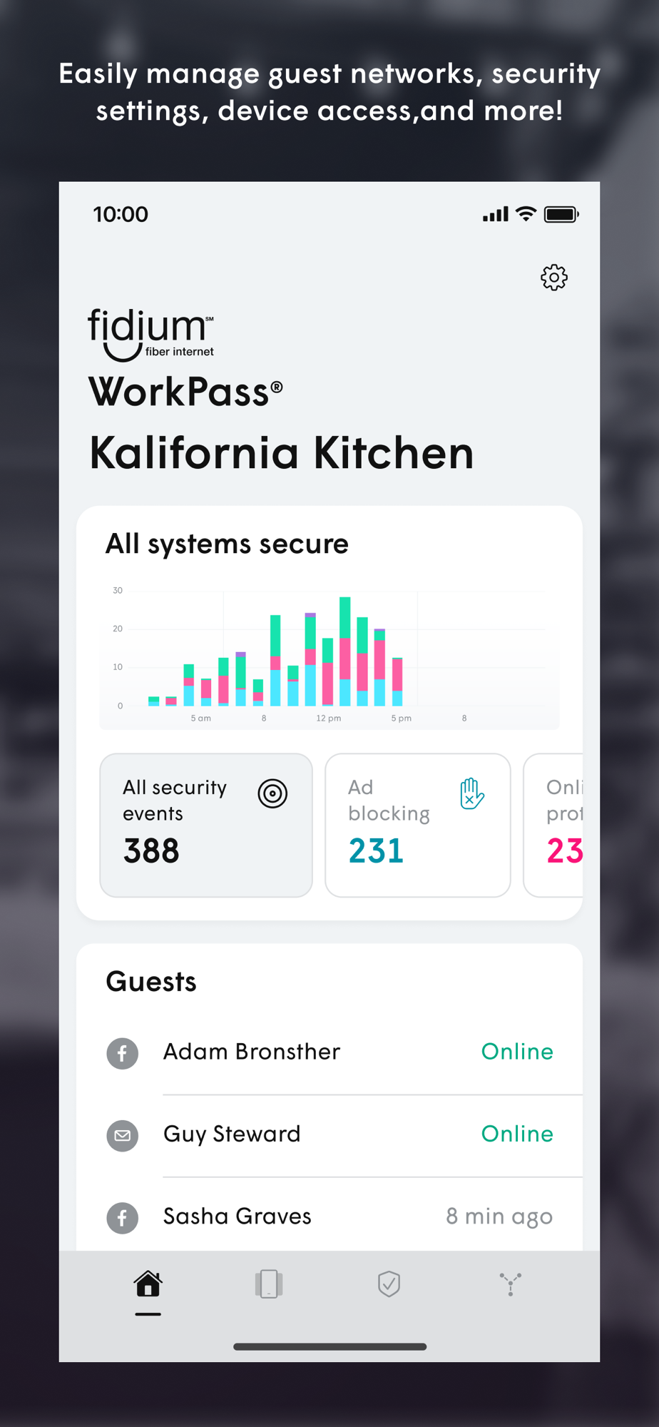 Our Adaptive WiFi offers reliable, consistent coverage while it learns from your employee’s preferences on how they connect. You can manage changes, make updates and glean valuable insights to run your business at peak performance every day. Built-in business-grade network security, coupled with physical on-site security options, give your business the protection you’ve been looking for, without all the upkeep. Workforce management and workflow tools put you in control, allowing you to make informed staffing decisions — and you don’t have to spend capital on IT resources. You can easily set up guest WiFi networks with device access requirements and controls.