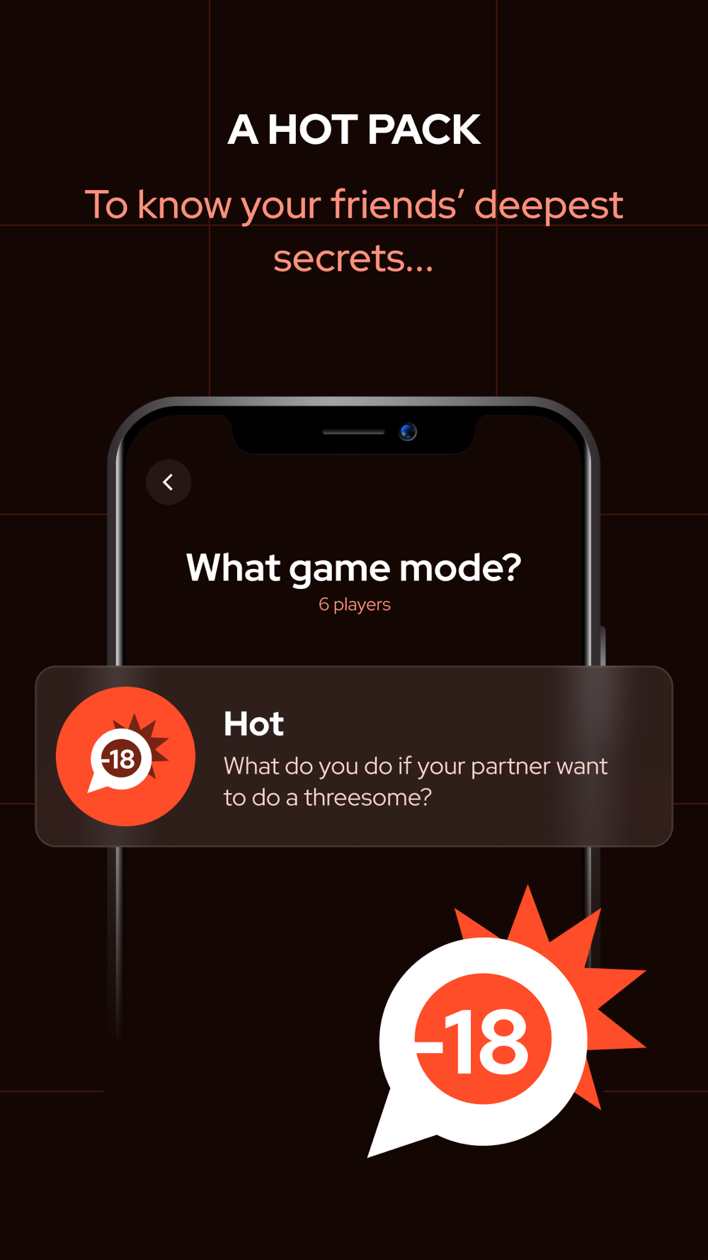 Think you've heard it all? Wait until you dive into our “Hot” pack. A pack where nothing is censored, designed to heat up your evenings and reveal your friends' most intimate secrets. In this spicy pack, the questions know no limits. Dare to debate topics like “What do you do if your partner offers you a threesome?” or “What’s your best memory in bed?” Learn more about the intimacy of your friends and break taboos. Prepare for shocking confessions, laughs and moments that will strengthen the bonds between you.
