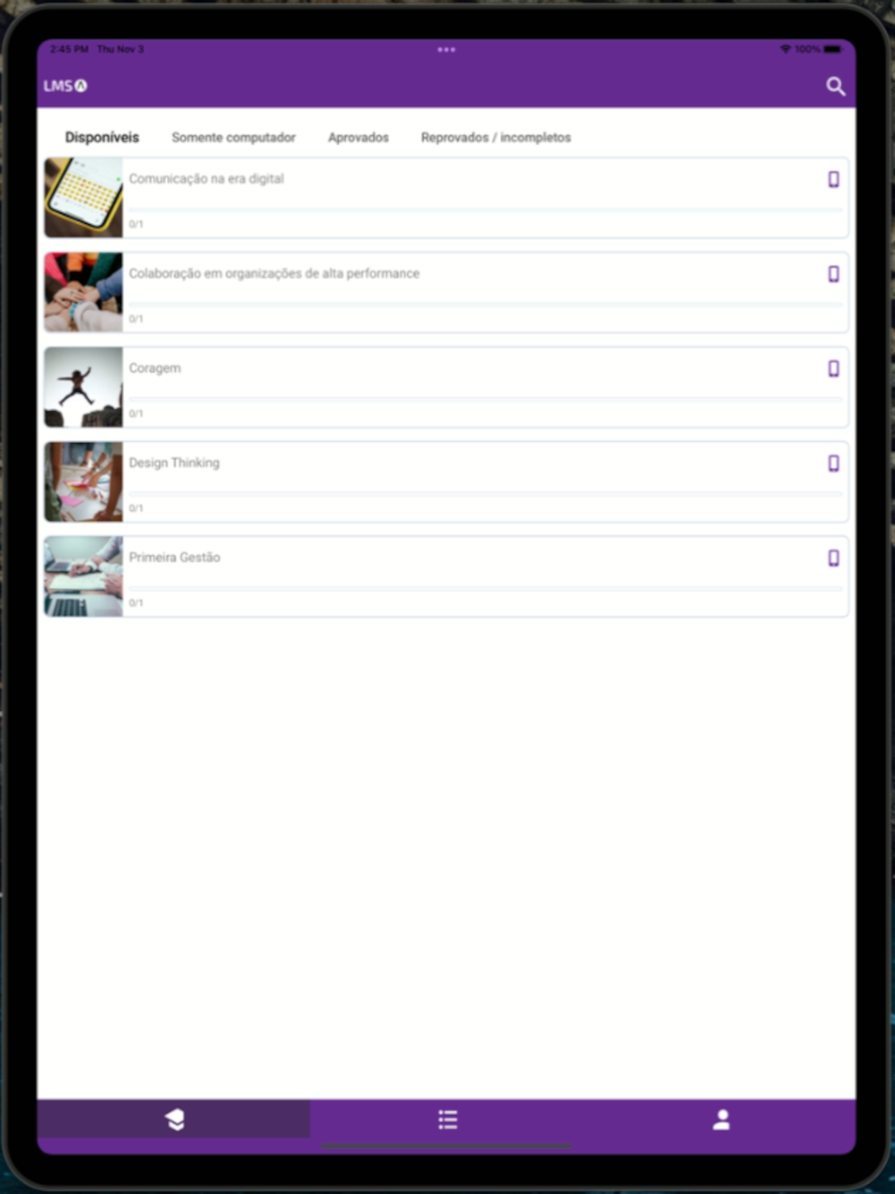 - Acesse os cursos onde se encontra matriculado e que a empresa autoriza a realizar via App, navegando por status do curso: não iniciado, em andamento, concluídos ou incompletos;