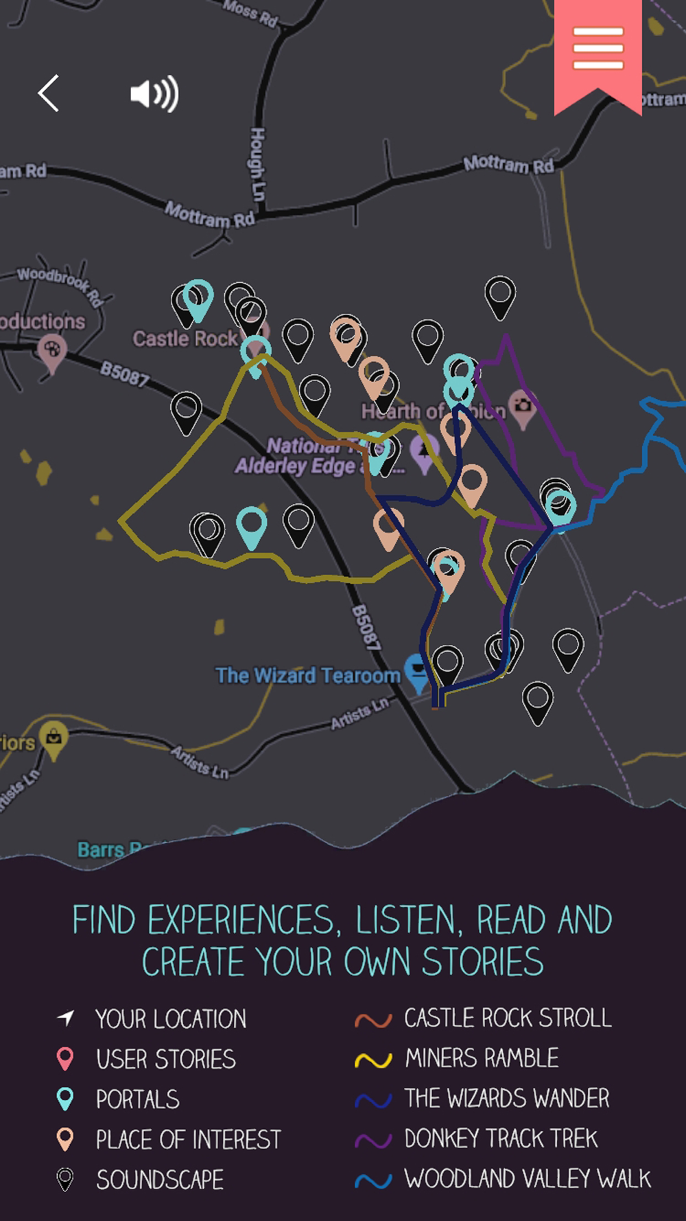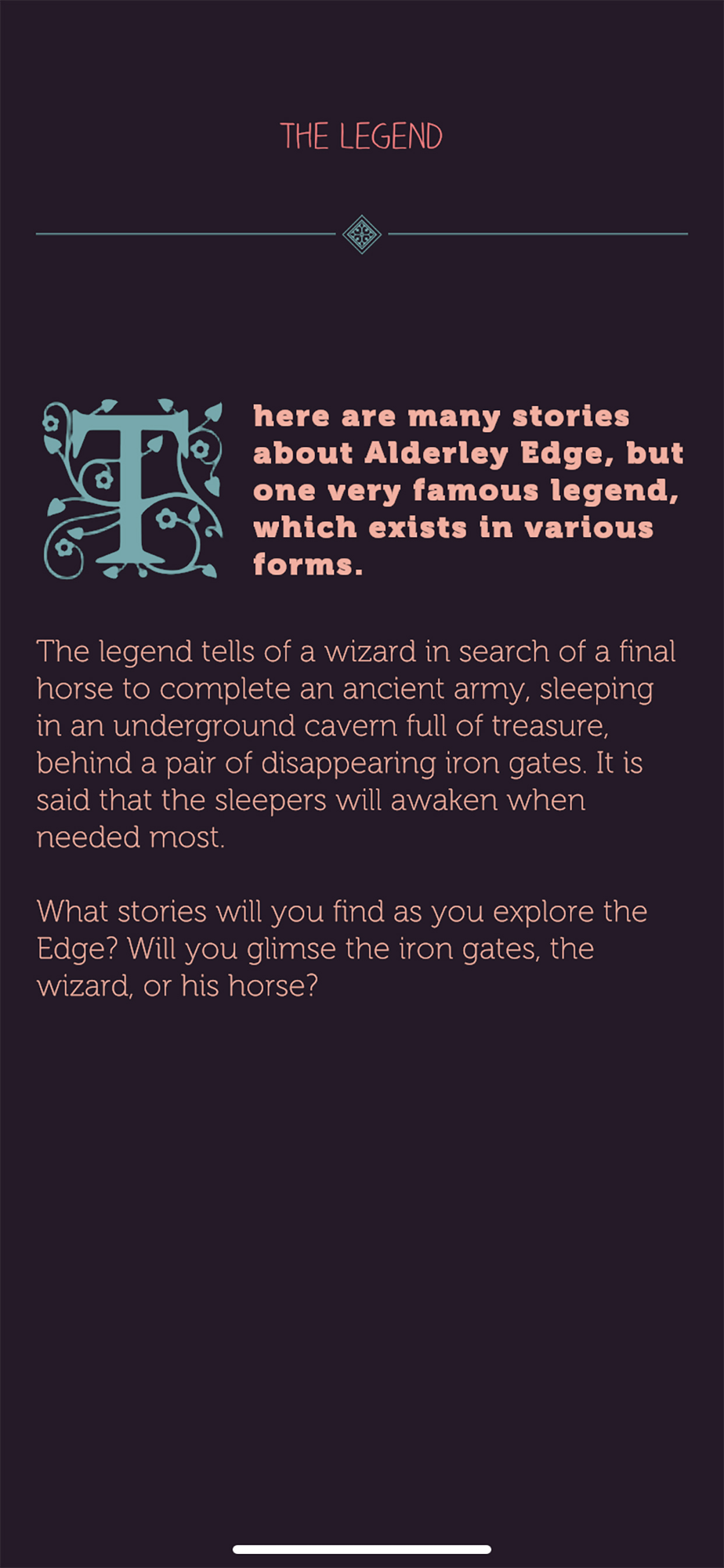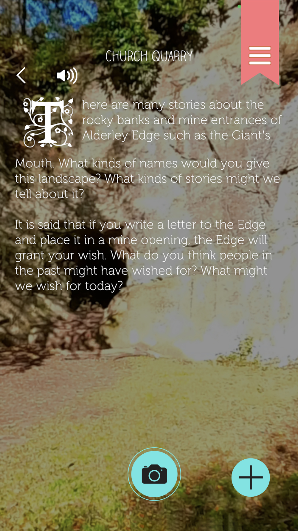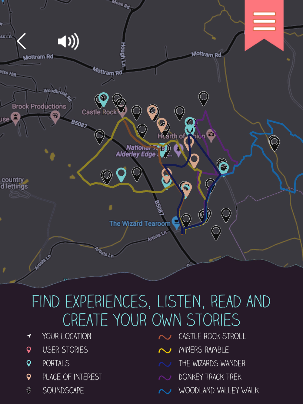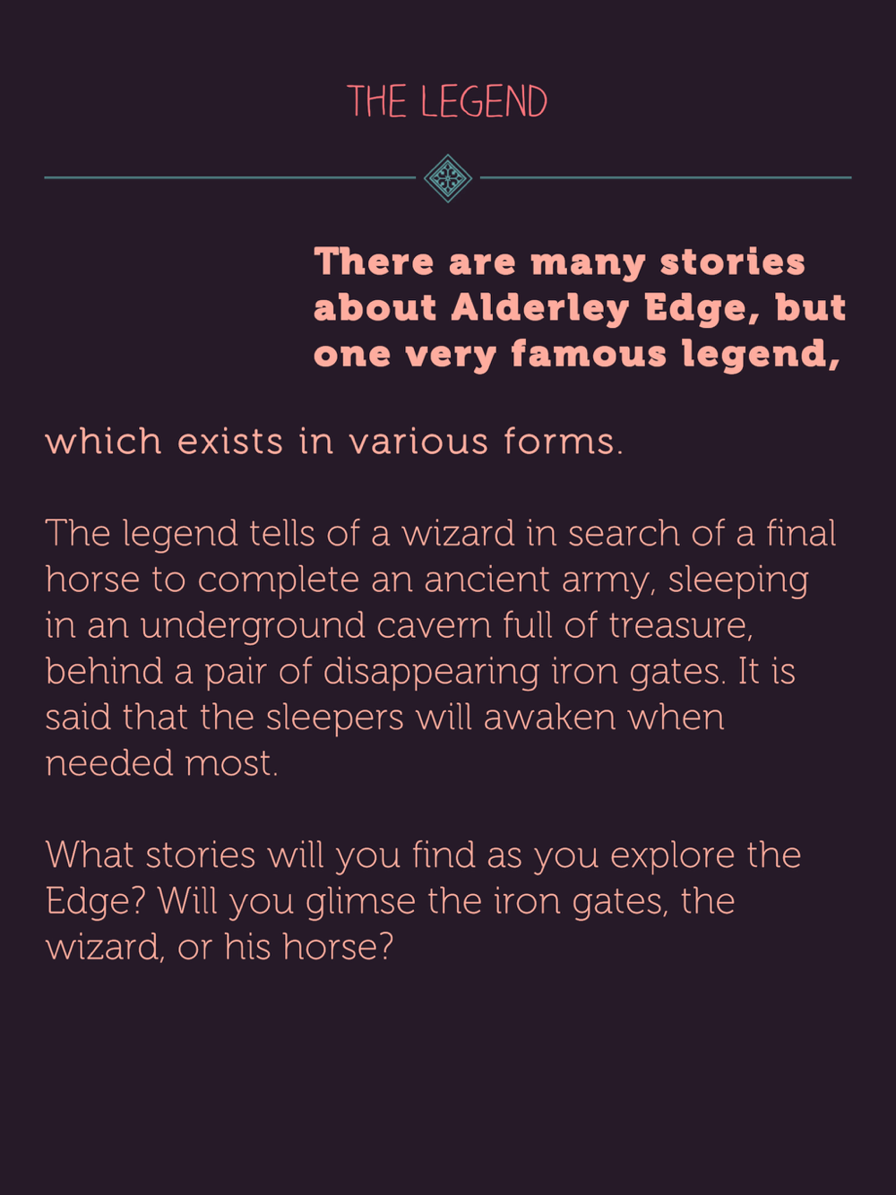 Explore the invisible world of Alderley Edge (National Trust, Cheshire, England) and discover the stories hidden beneath its surface. Viewing from your own home or travelling across the Edge you’ll find portals to forgotten legends of wizards and white horses. Seek treasures underground and travel to the stars. Read the stories left behind by other explorers of the Edge and immerse yourself in soundscapes and augmented reality. Create and share your own stories and become a storyteller yourself, gathering and passing on the legends of the Edge.