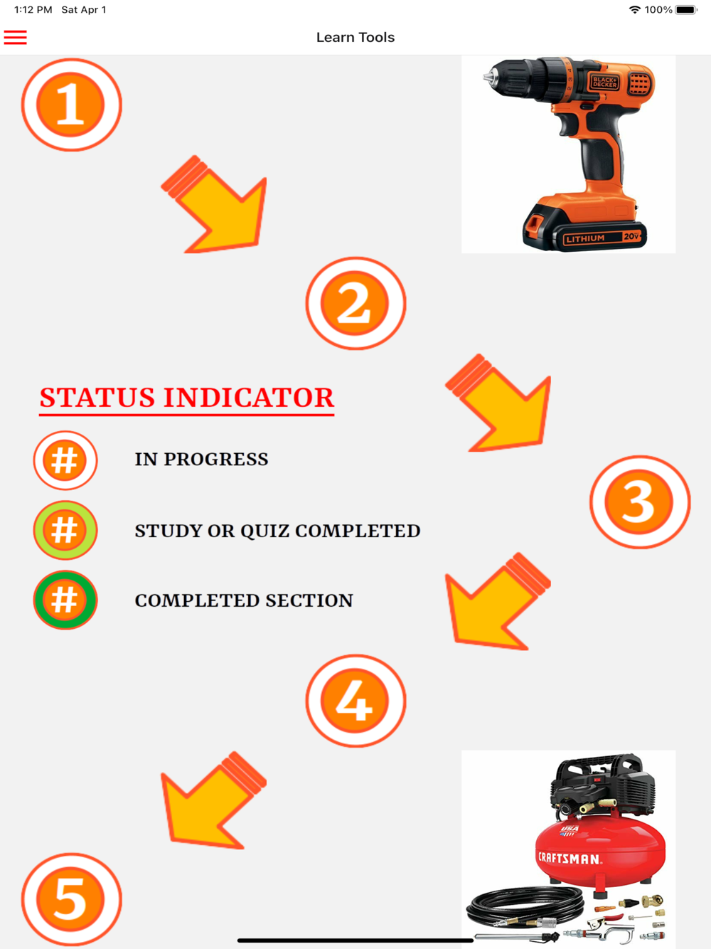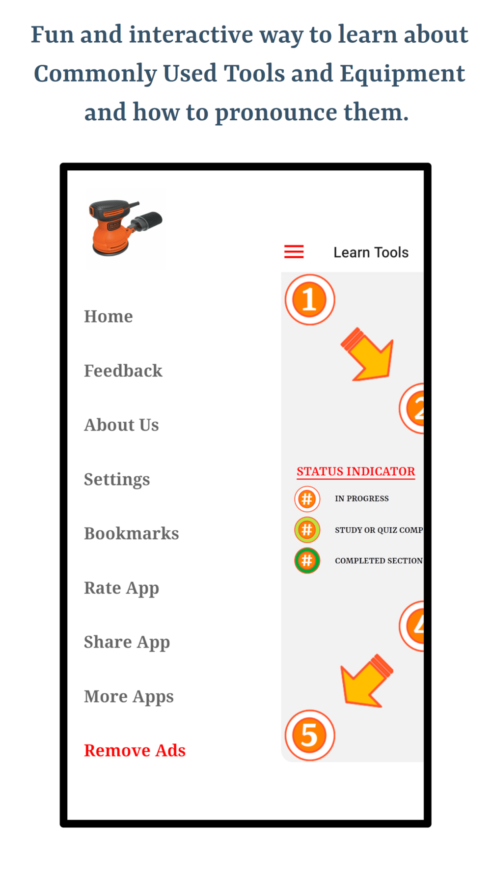 This app is a great resource to memorize Tools And Equipment . The app is engineered to make users perfect identifying tools And equipment by studying for a very short amount of time. Audio functionality and bookmarking is available throughout the app on chapter, section, study mode and quiz modes.