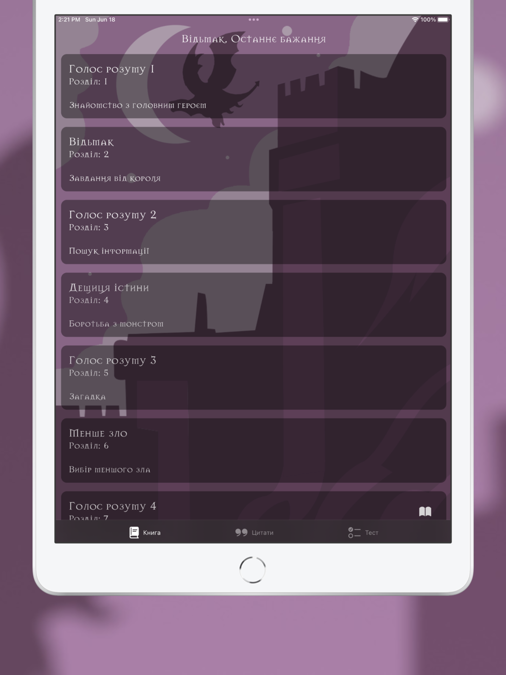 Зануртеся у світ пригод, магії та битв разом із неперевершеною аудіокнигою «Відьмак. Останнє бажання». Ми створили додаток, який не має аналогів: він поєднує атмосферне звучання, унікальний дизайн та інтерактивні можливості, щоб подарувати вам максимальне занурення у всесвіт Відьмака.