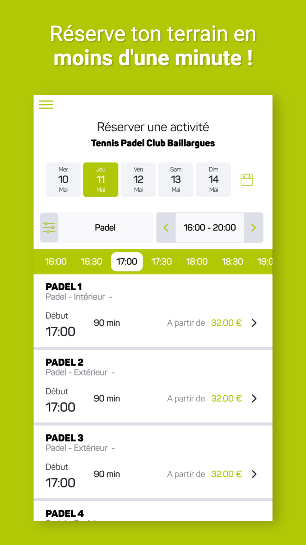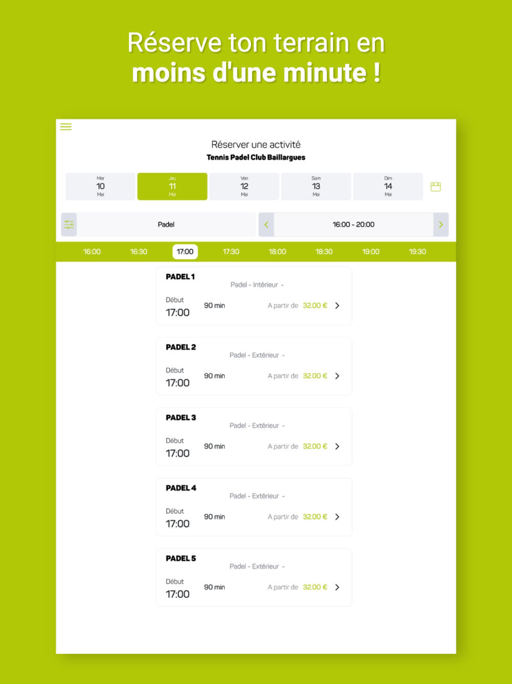 Fini la corvée de réservation ! Avec l'application tu n'as plus qu'à accéder aux créneaux disponibles et à en choisir un. Le club recevra alors automatiquement ta réservation.