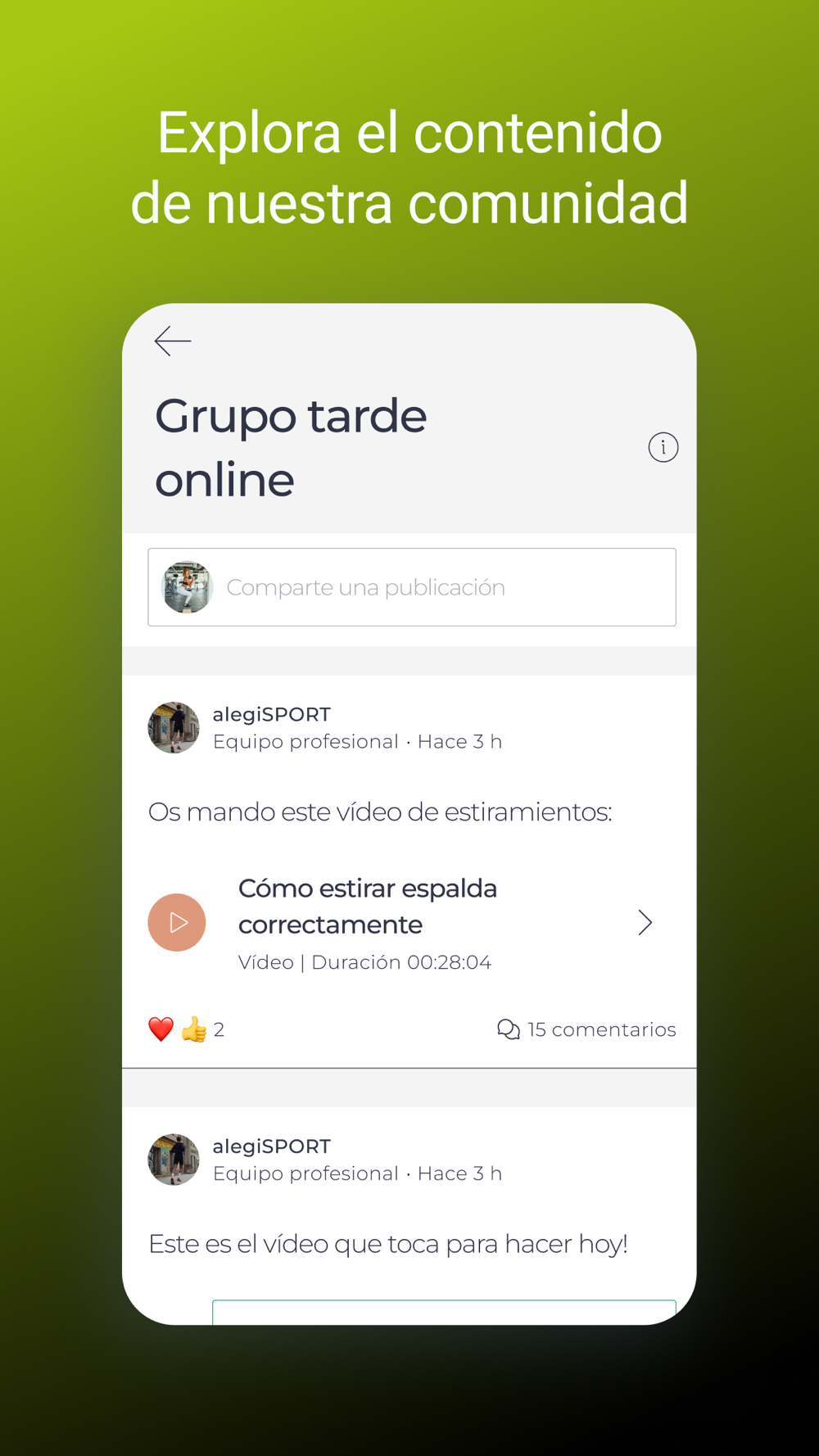 Únete a nuestra comunidad exclusiva para miembros, donde podrás compartir tus progresos, retos y motivaciones con otros miembros de alegiSPORT.