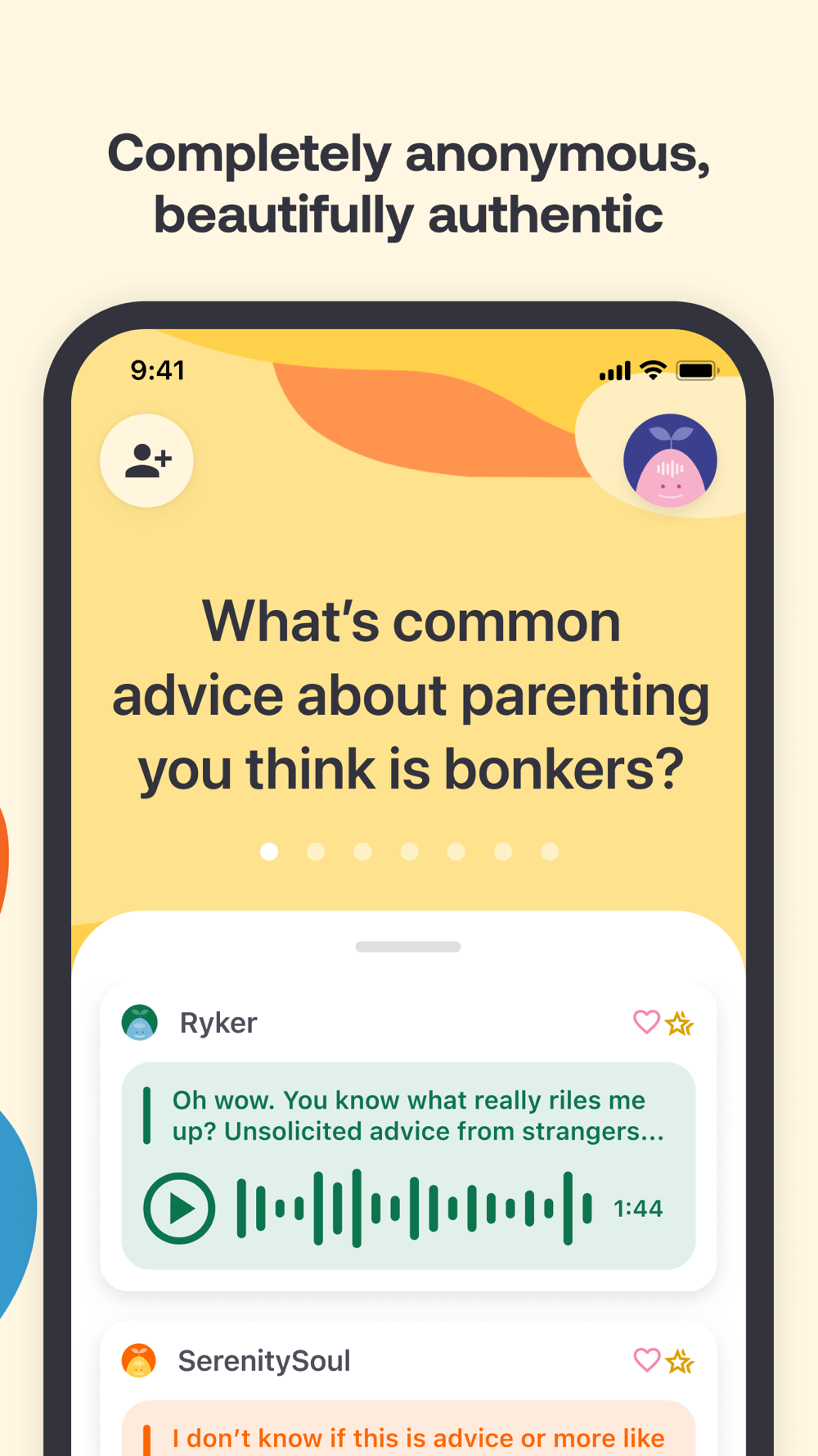 • Completely anonymous, beautifully authentic: Share your experiences and listen to others using only the power of voice, all in complete anonymity, allowing you to express yourself authentically