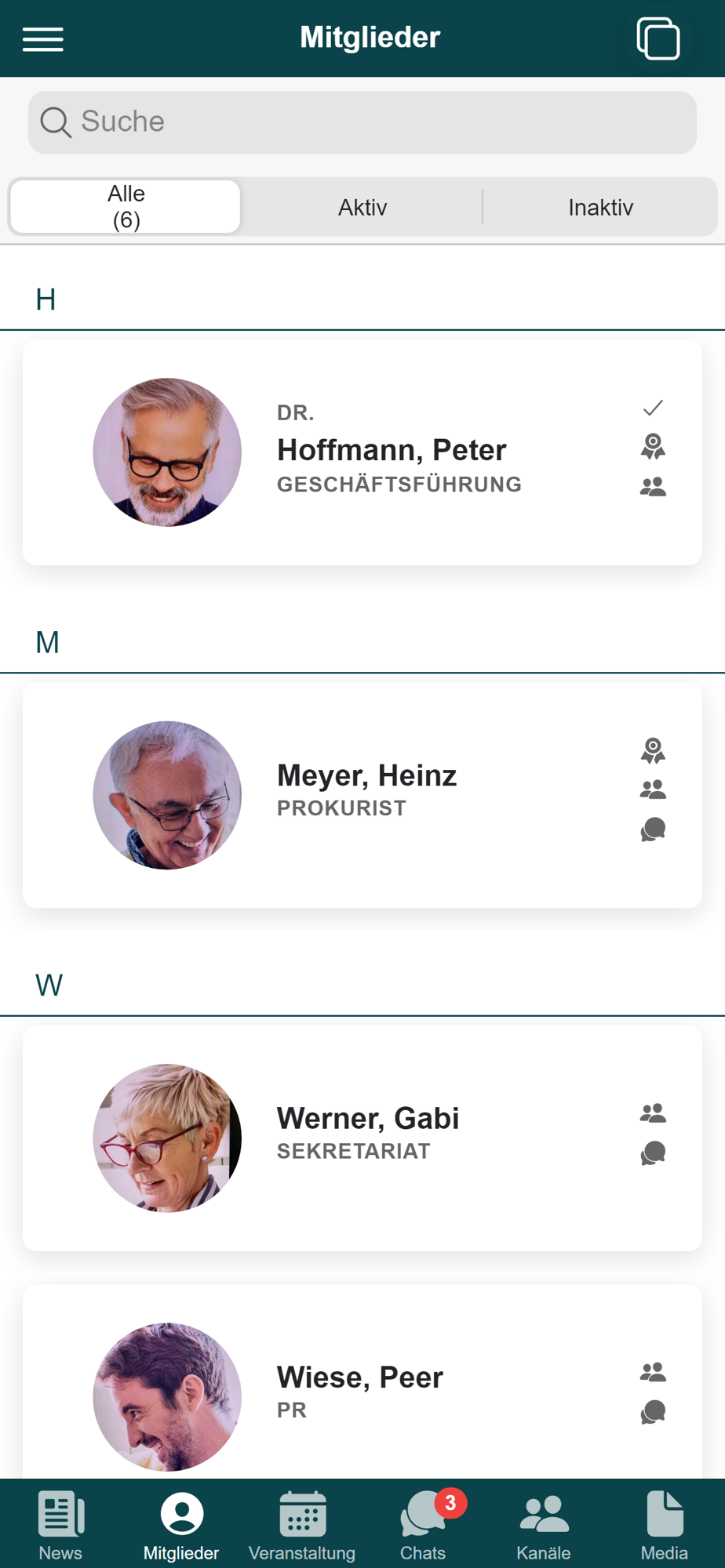 Organisieren Sie Ihren Social-Club vollumfänglich digital: Kommunikation von Neuigkeiten und Mitgliederzeitschriften, Verwaltung aller Mitgliederdaten, Erstellung von Projektgruppen, Organisation von Veranstaltungen mit Zu- und Absagen, Einzel-, Gruppen und Organisations-Chat, Bereitstellung von Dokumenten, öffentliche Fotopinnwand und vieles mehr ...