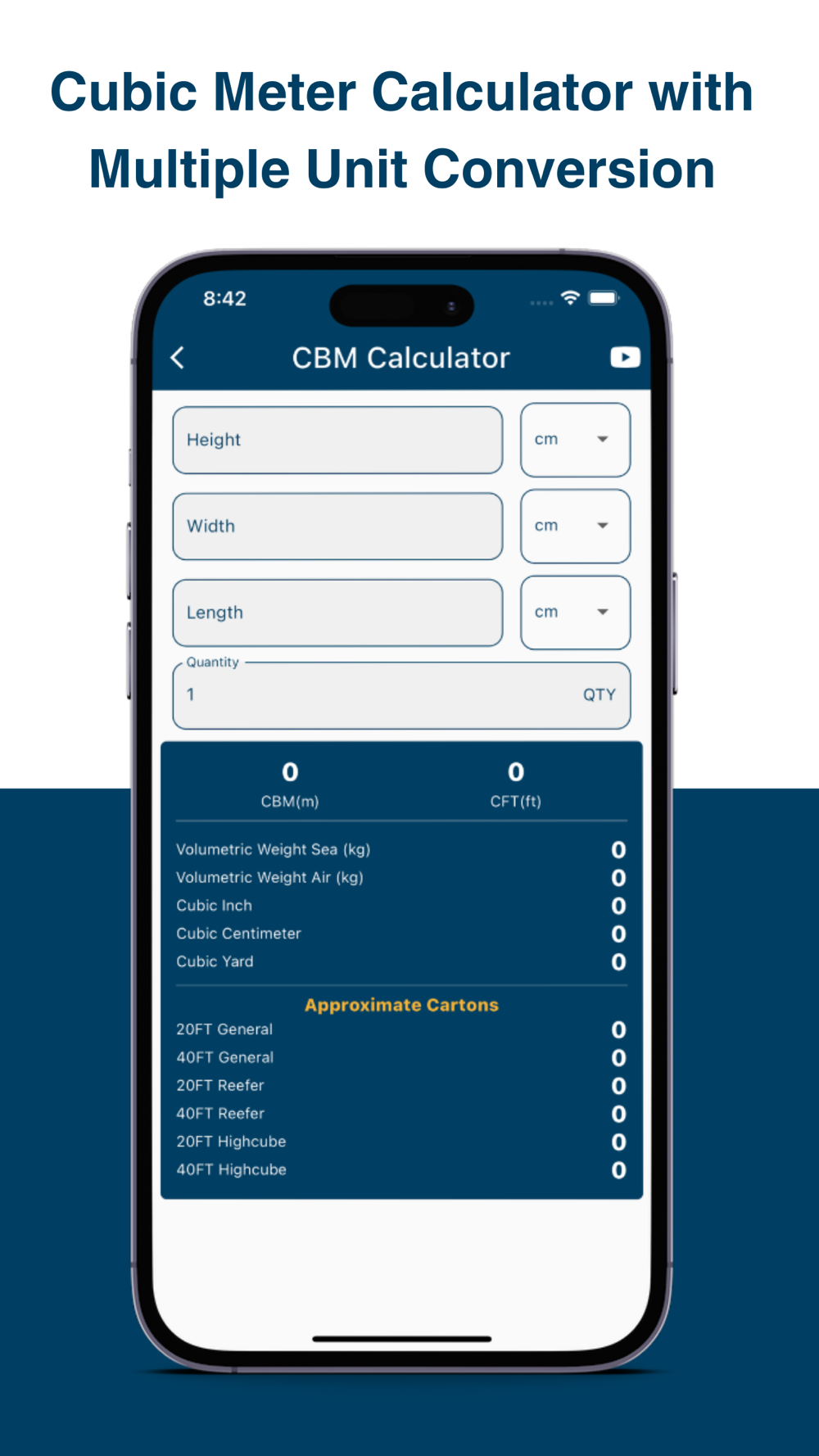 Effortless Cargo Volume Calculation: The CBM Calculator Pro simplifies the process of determining the cubic meter volume of your cargo. All you need to do is input the dimensions (length, width, and height) of your cargo, and the app will instantly calculate the CBM, eliminating the need for manual calculations.