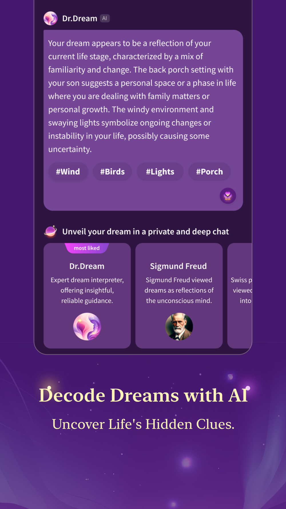 - In-depth Dream Interpretation: Combining cutting-edge AI technology and psychological expertise to decipher your dreams, forging connections to life events to provide comfort and guidance.