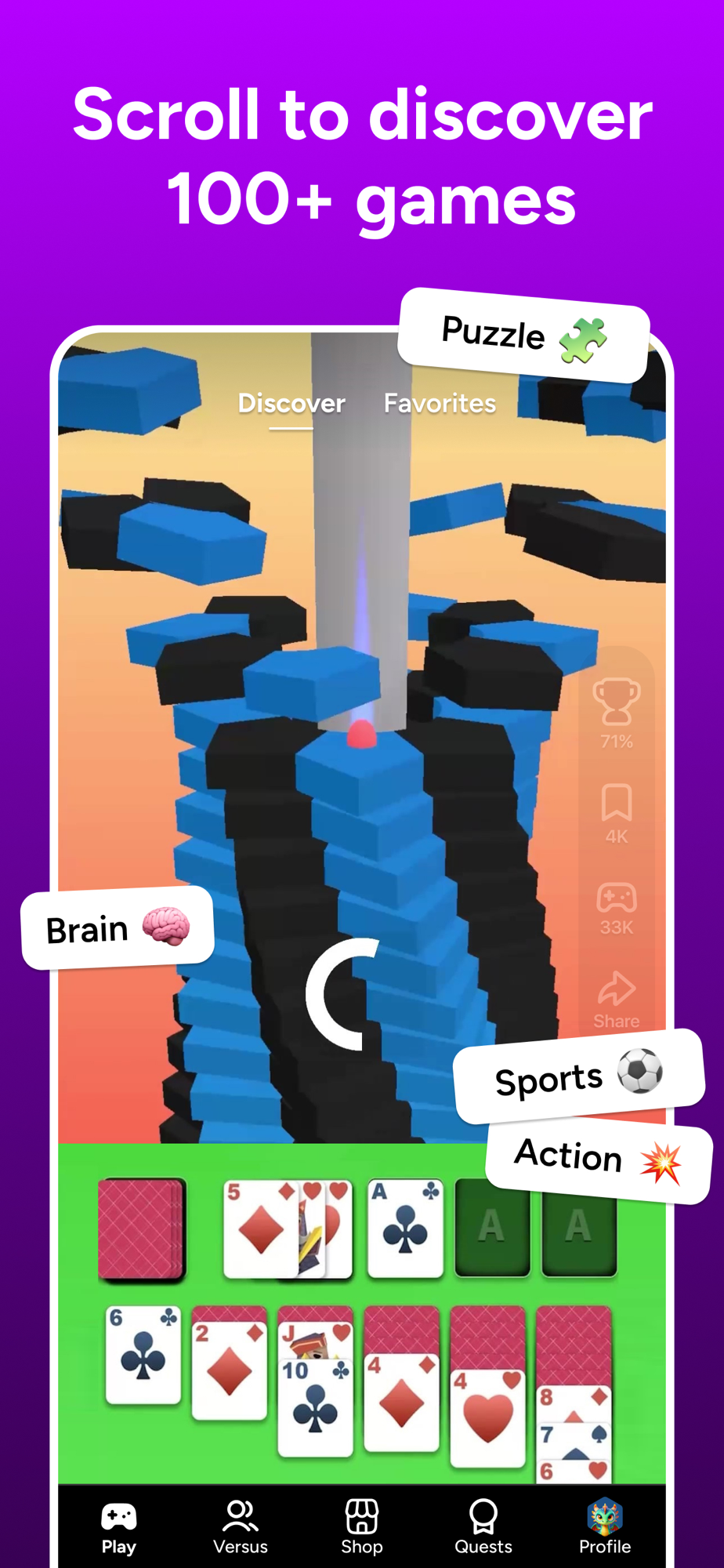 The Discover feed updates all the time with cool, satisfying games to try. Puzzle, reflex, action: whatever your vibe, there’s something new and fun waiting for you. Just open the app and dive in.