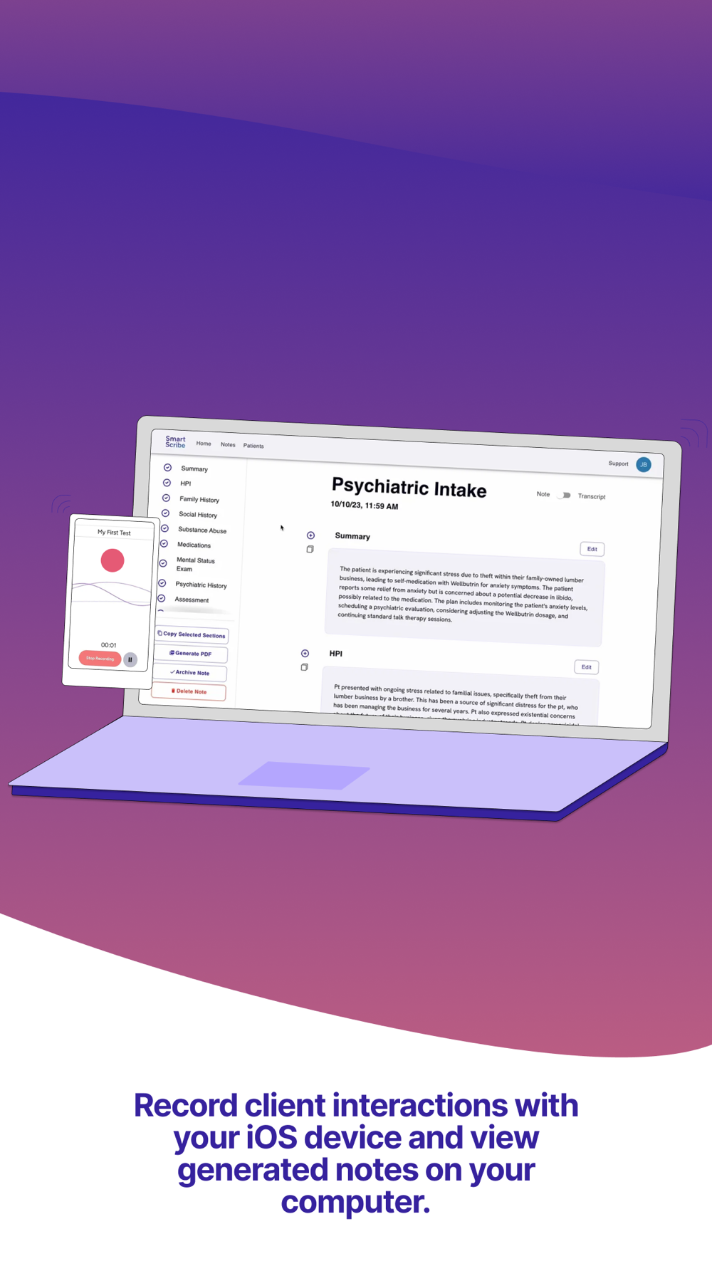 JotPsych (by SmartScribe) listens to your patient interactions and generates complete, HIPAA-compliant, medically-accurate notes. All you need to do is review, edit, and approve. Download the JotPsych companion application on your phone to record your patient encounters for in-person and Telehealth visits.