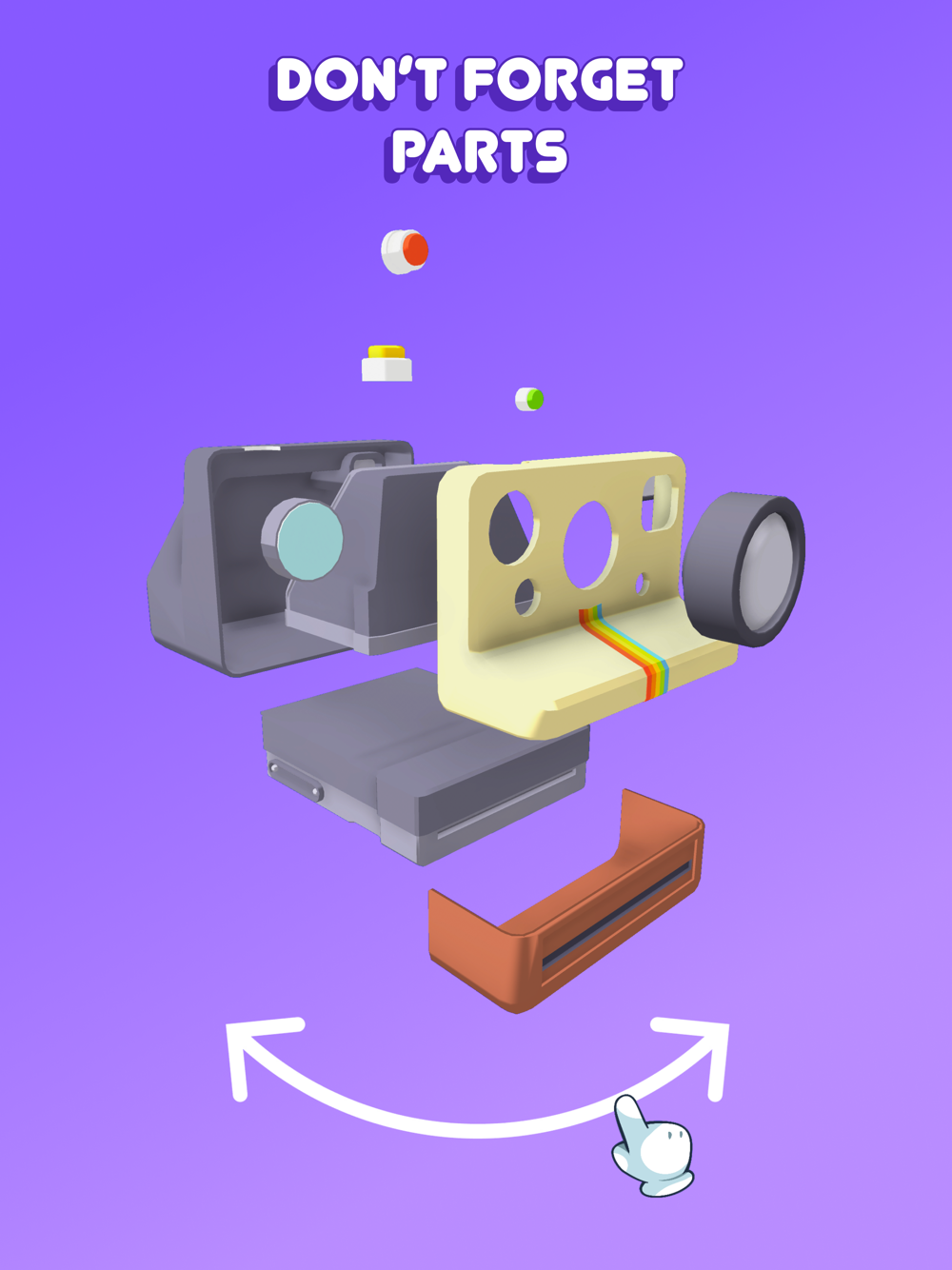 Assemble the parts in the right order to see the final product. Build products from small parts in the right order.