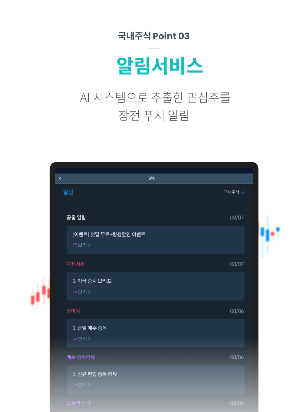 다수의 증권사에서 수년간 검증을 마친 고도화된 인공지능(AI)로봇이 AI종목추천을 통해 스마트한 투자전략을 제시합니다.
