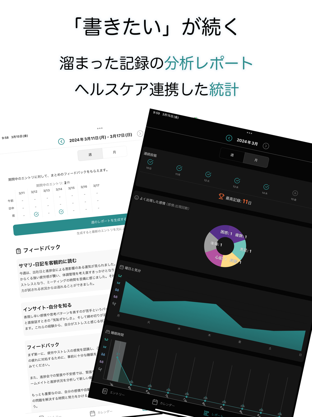 気分アイコンをタップして、思ったことや日記を書くだけ。