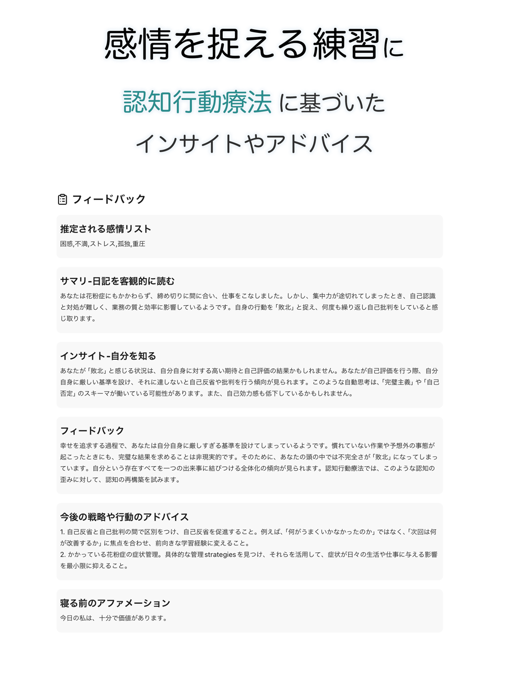 あなたの背景情報と日記・思ったことに対して、フィードバックを返してくれます。