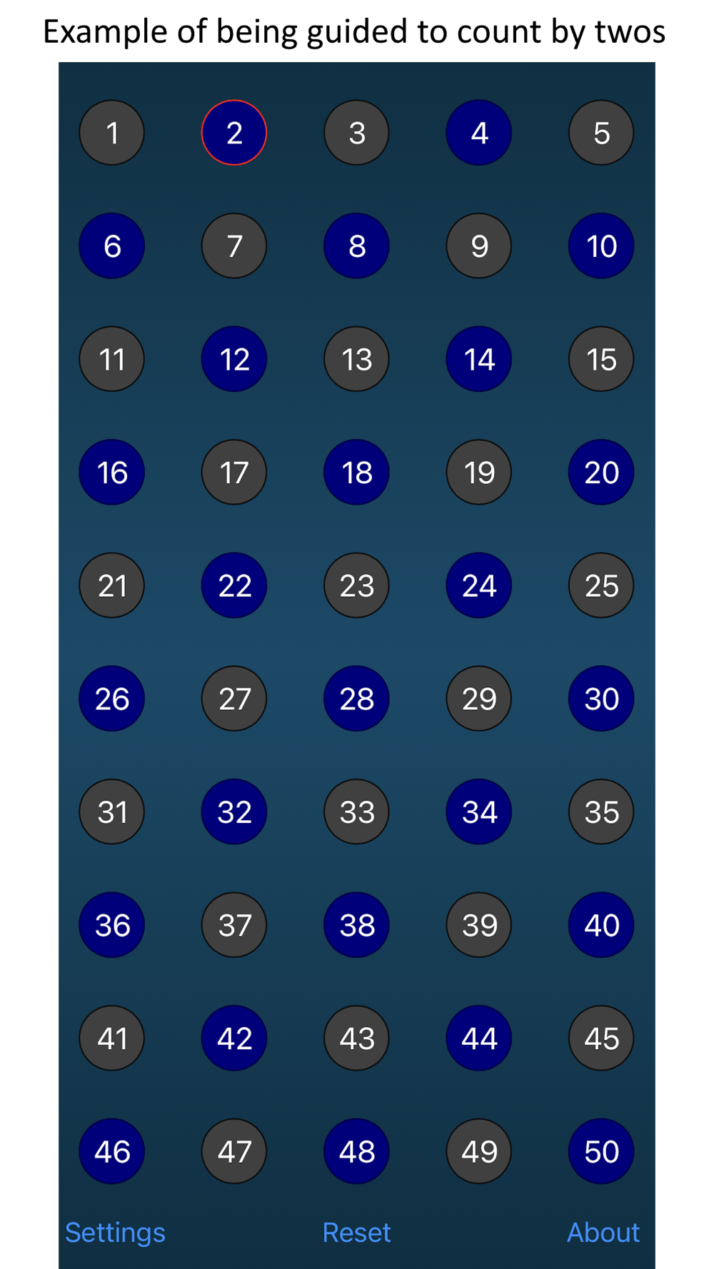 Added more numbers to count by. Now it will guide to count by 1's, 2's, 3's, 4's, 5's, 6's, 7's, 8's, 9's, 10's, 20's and 25's.