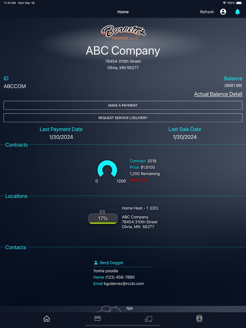 Information at your fingertips! This app gives you direct access to your account balance, location and contract information. It also gives you the ability to store and process payment and request service work and deliveries directly through the app.