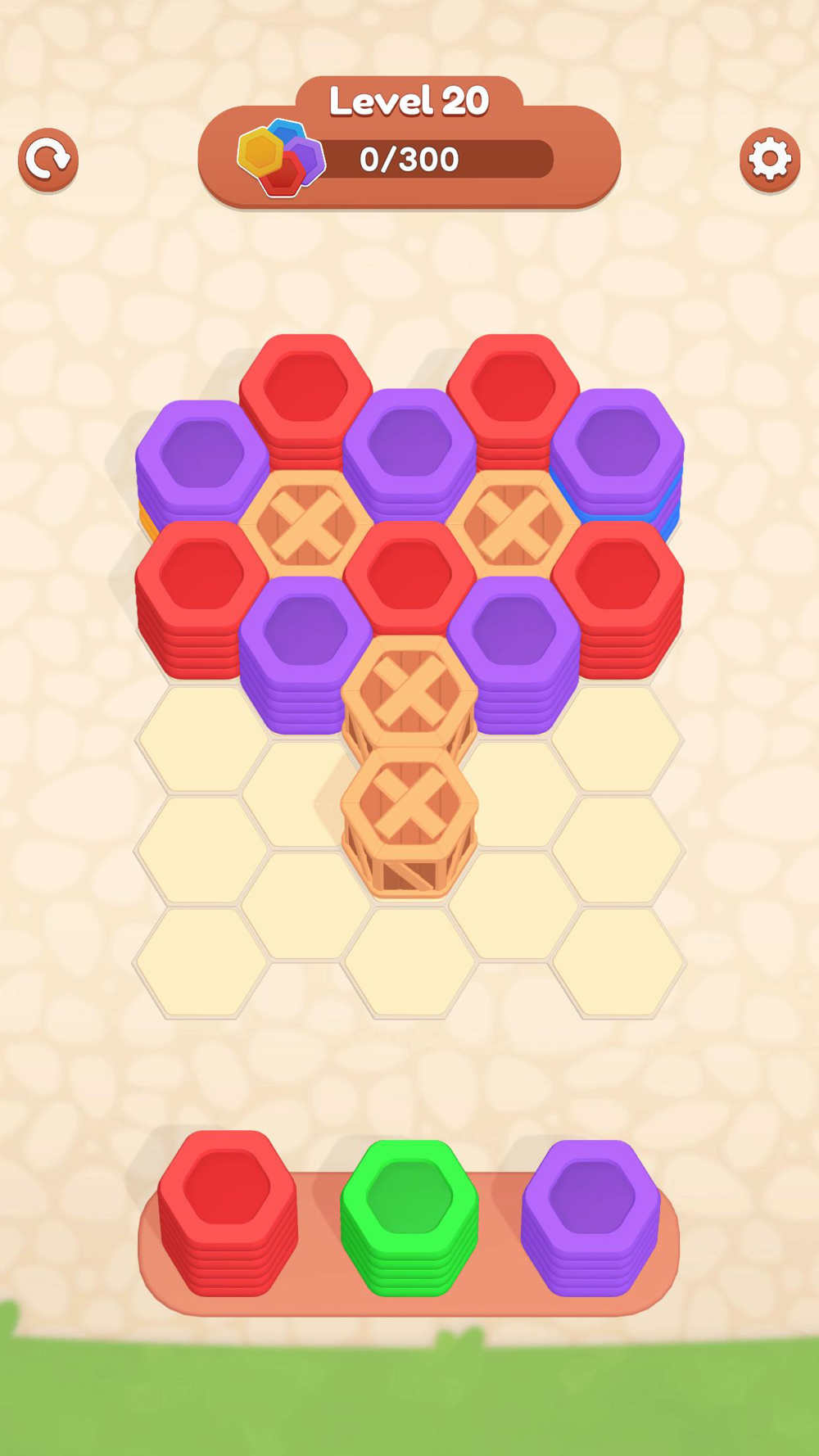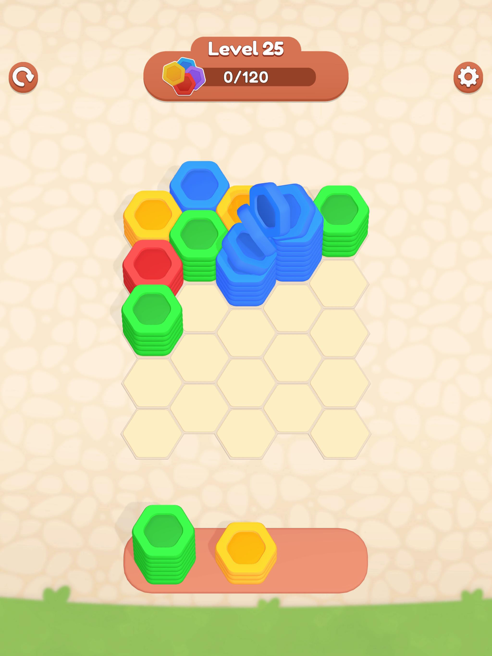 Drag and drop the hexagons, stack and sort to complete level score and win!