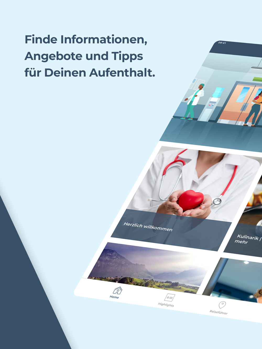 Du planst den Besuch Deiner Angehörigen und bist auf der Suche nach Aktivitäten und Ausflugstipps rund um das Reha-Zentrum, das Krankenhaus, die Akutklinik oder die Fachklinik? Entdecke Tipps, Routen und Touren sowie Events für die Region im digitalen Reiseführer. Zudem hast Du mit dem digitalen Patientenbegleiter nützliche Adressen und Telefonnummern, Infos zum öffentlichen Nahverkehr sowie aktuelle Wetterprognosen immer auf Deinem Smartphone mit dabei.