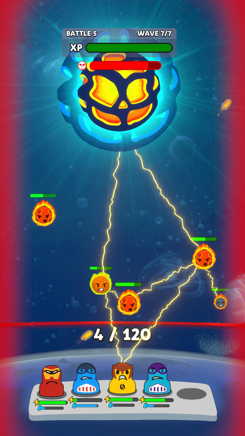 Every hero in your squad comes with unique abilities that can be upgraded using cards. Cards are earned by defeating enemies and filling up the XP bar. Once filled, you’ll be presented with three cards that offer new abilities or upgrades for your heroes. These upgrades can significantly enhance your heroes' performance, giving you an edge against the increasingly challenging waves of meteors.