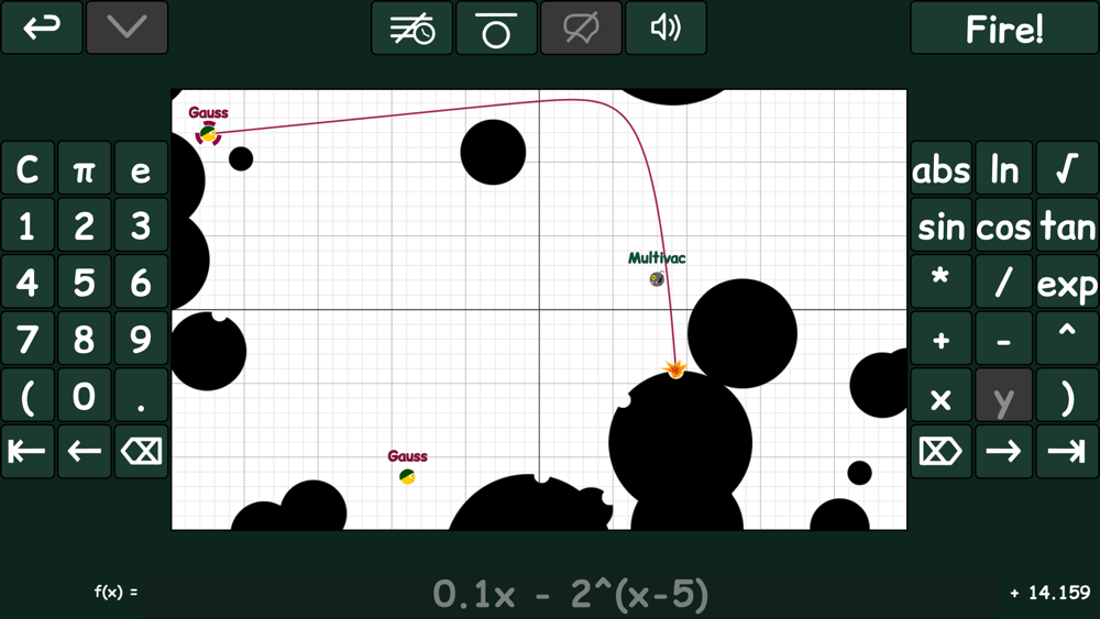 Graphwar II is the successor to the acclaimed Graphwar game. It is an artillery game in which you must hit your enemies using mathematical functions. The trajectory of your shot is determined by the function you wrote, and your goal is to avoid the obstacles and your teammates and hit your enemies. The game takes place in a Cartesian Plane.