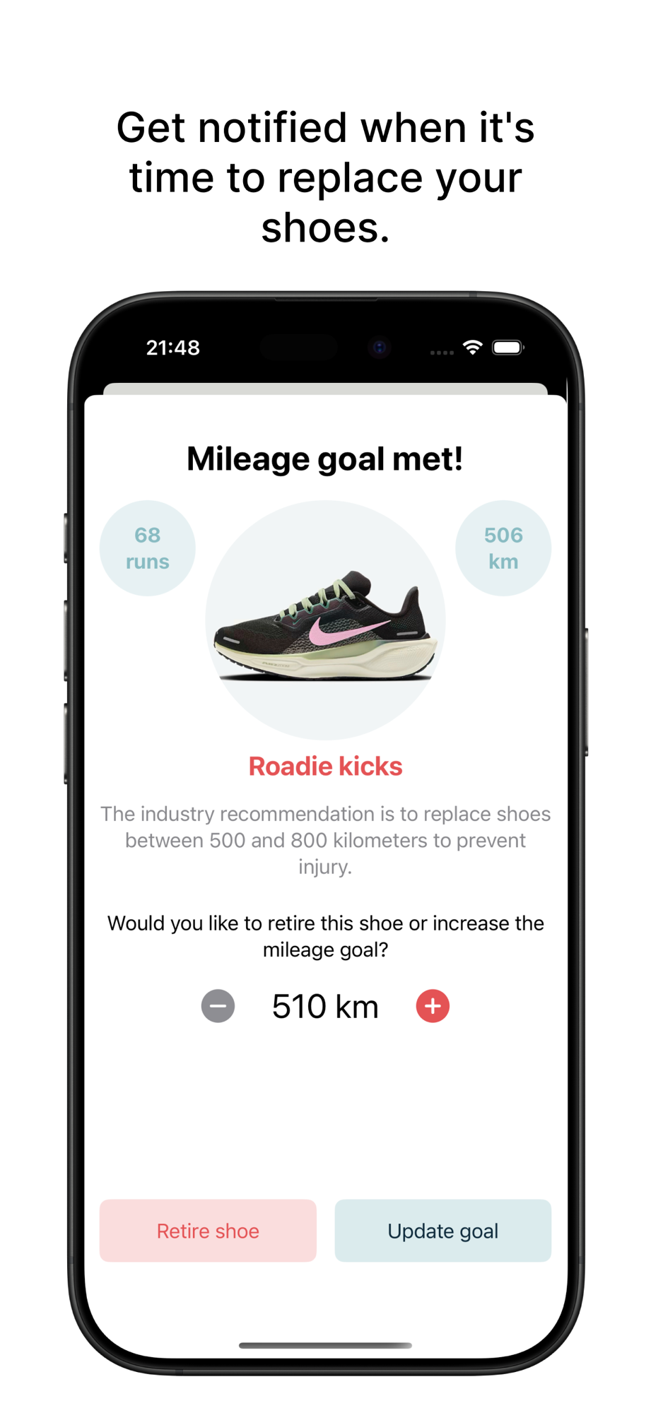 After every workout, TrackMyShoe reminds you to assign the shoes you wore, so you always know which ones need replacing soon.