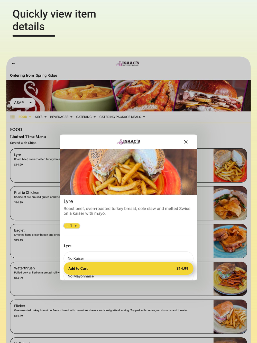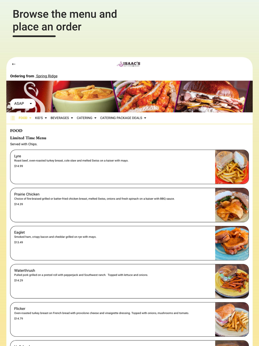 Use the Isaac's Craft Kitchen & Brewery app to find your nearest location, view our menu, and place an order. Save time by ordering ahead. Earn loyalty points and track your rewards status from within the app. Local restaurant & brewery chain featuring grilled sandwiches, made-from-scratch soups, fresh green salads and craft beers.