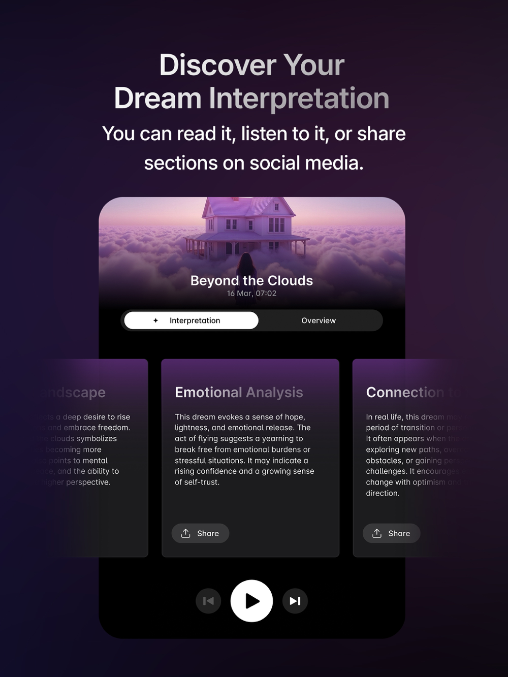 Share your dream interpretations directly on social media with just a tap.