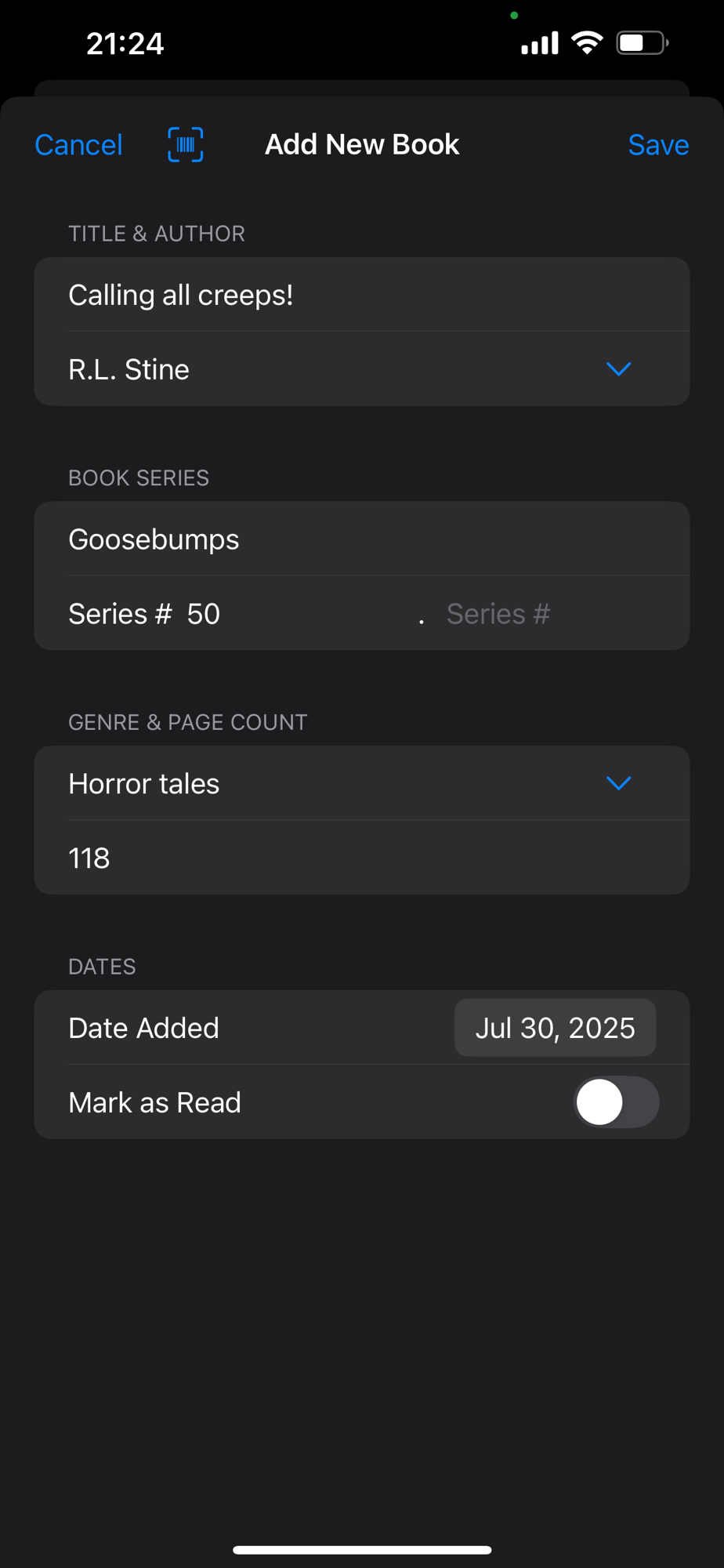 Build Your Digital Bookshelf: Easily add books with title, author, series, genre, and page count.