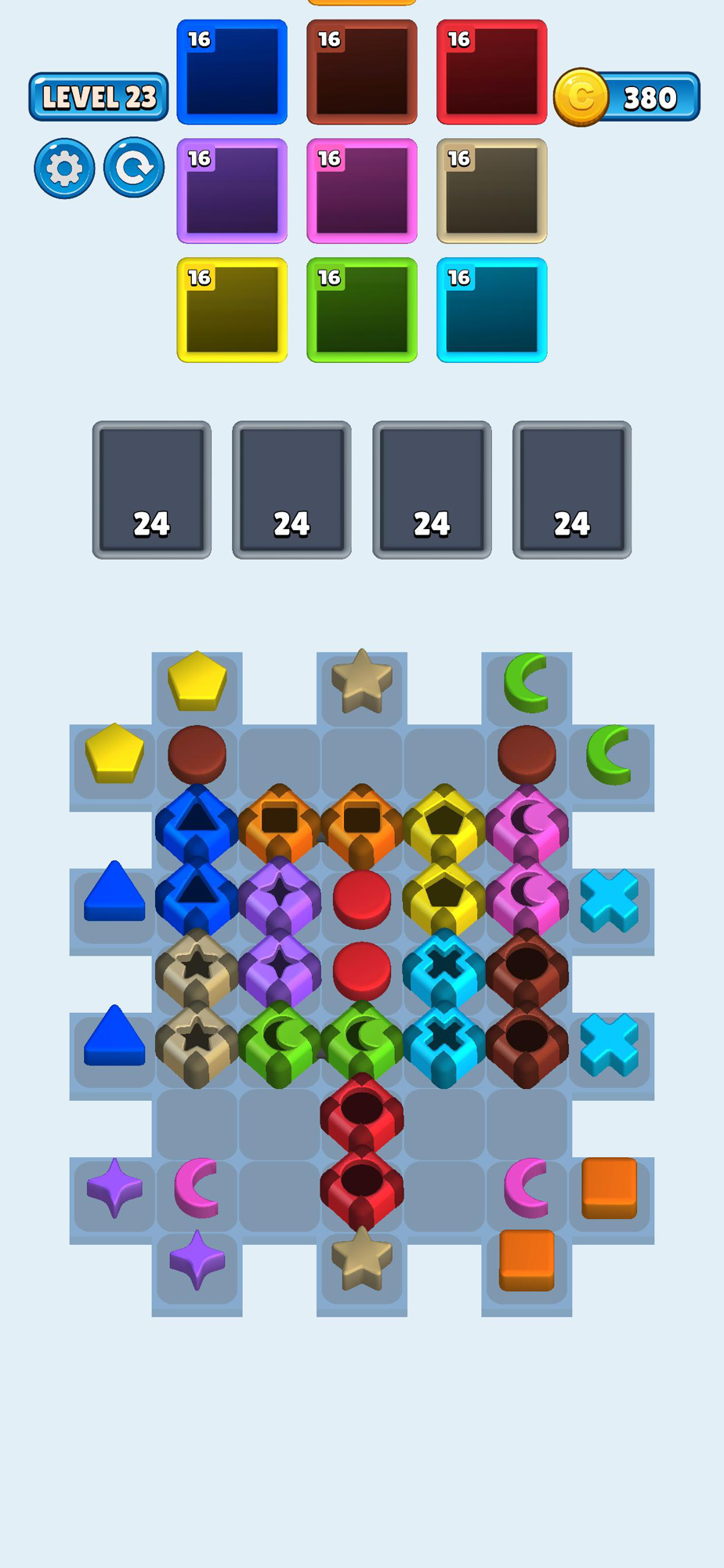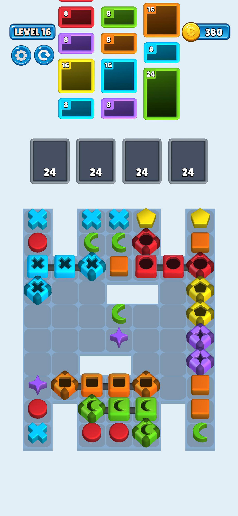 You control a snake made of cubes, each with its own color and hole shape. On the board, matching pieces appear—your task is to guide the cube snake and fit the correct pieces into every hole.