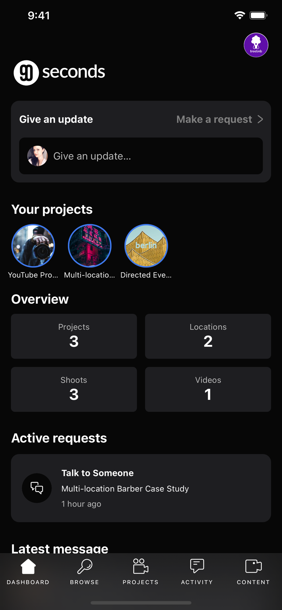 The 90 Seconds mobile app provides always-on connectivity and collaboration with the full 90 Seconds video creation platform. Using the app, you can: