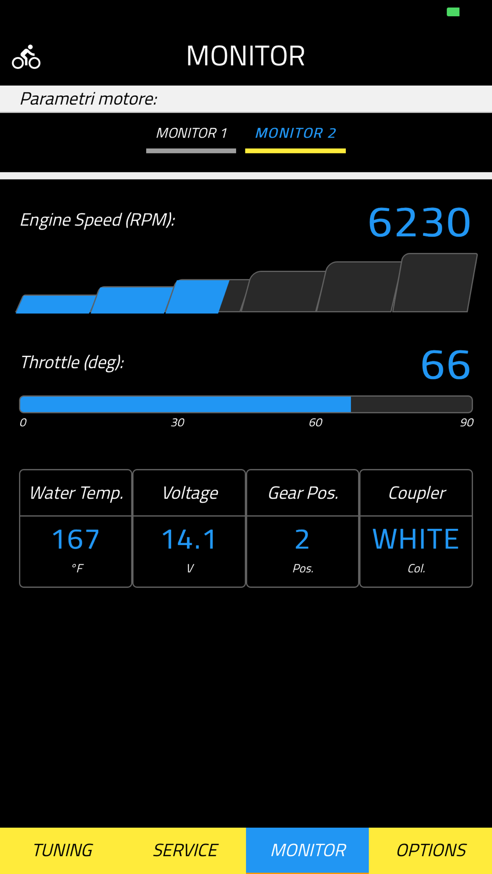Using WiGET the user can easily select from different pre-set map settings developed by factory, or create a custom one for its needs. Maps can also be shared between users. Depending on bike model, the app also makes it possible to: read ECU hour meter, add service notes, read diagnotics, display real time engine data, and manage user notes.