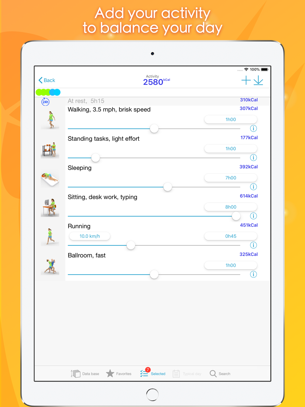 Quickly count your calories, and deduct your energy expenditures (activities) to find out how much calories you have stored or burned today. Numerous graphs provide you with a complete analysis of your diet: