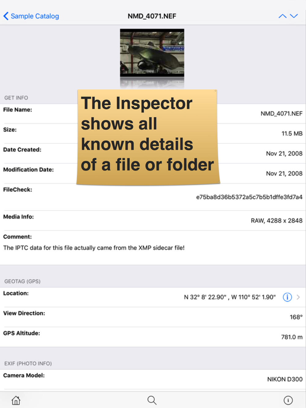 The Inspector shows you all the details of your cataloged files, including Previews, EXIF, IPTC, ID3, XMP, song lyrics, cover art, if they are included in your catalogs