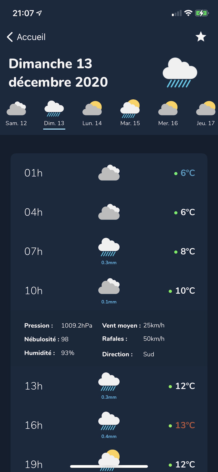 * Prévisions : prévisions globales pour la France à 3 jours, et pour toutes les villes de Frances et des milliers de villes en Europe ! (température, vent, direction du vent, humidité, pression, pluie... toutes les 3 heures) à 10 jours