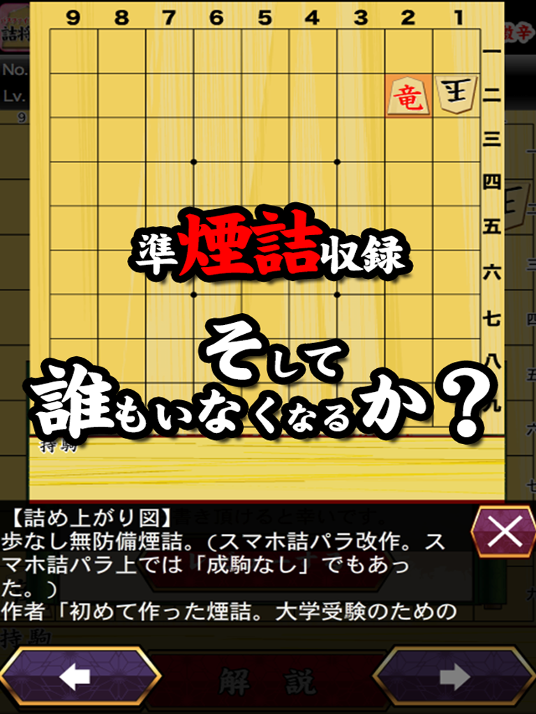 「詰将棋を解く」をタッチすると作品が表示されます。 攻方の駒をタッチすると選択状態になりますので、移動させたい箇所の盤上をやはりタッチします。 正解手ならば玉方が自動的に対応してくれます。不正解ならばその場で初手からやり直しになります。