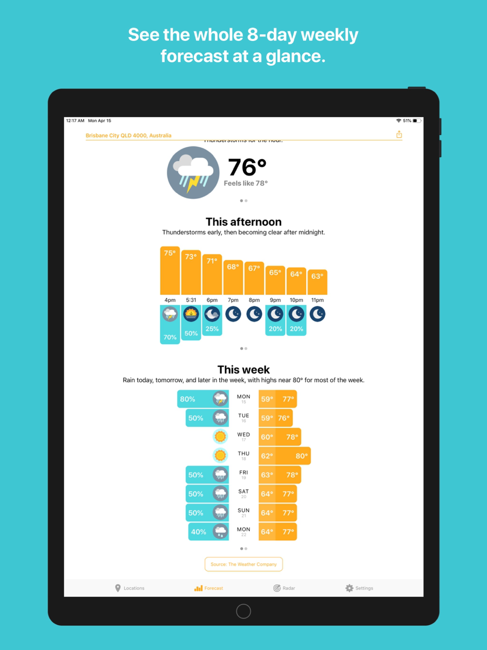 Our gorgeous, information-rich design shows you everything that matters in one simple screen. You’ll see the current conditions and future forecast in an instant.