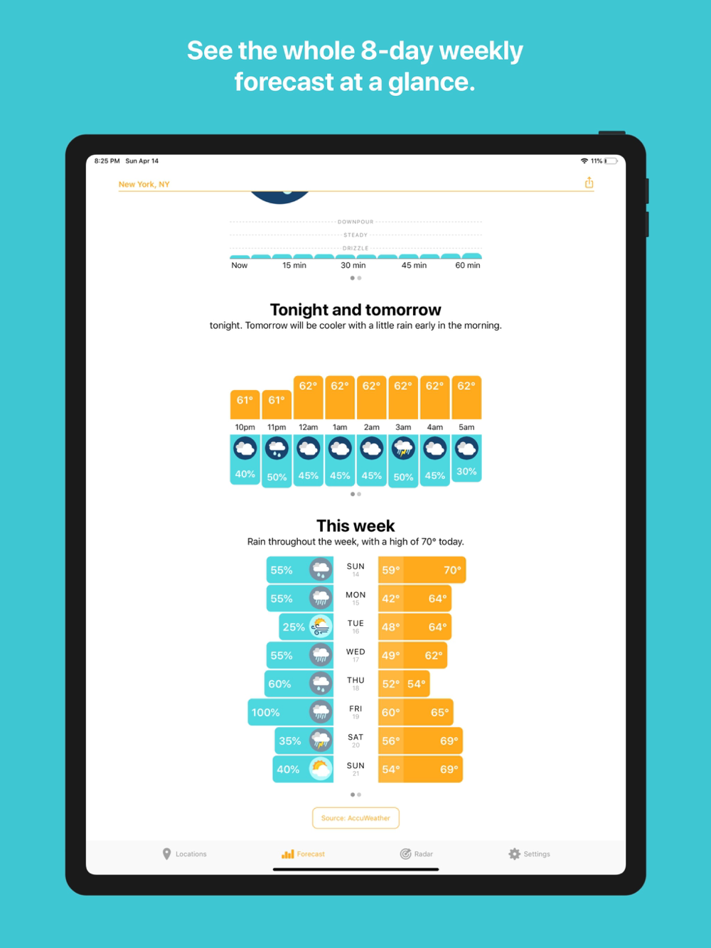 Hello Weather is more than a pretty face. It’s powered by the world’s best data sources, like Apple Weather, AccuWeather, Foreca, The Weather Company, and Tomorrow.io. Pick the provider that's best in your area, or switch back and forth to compare. (Upgrade required.)