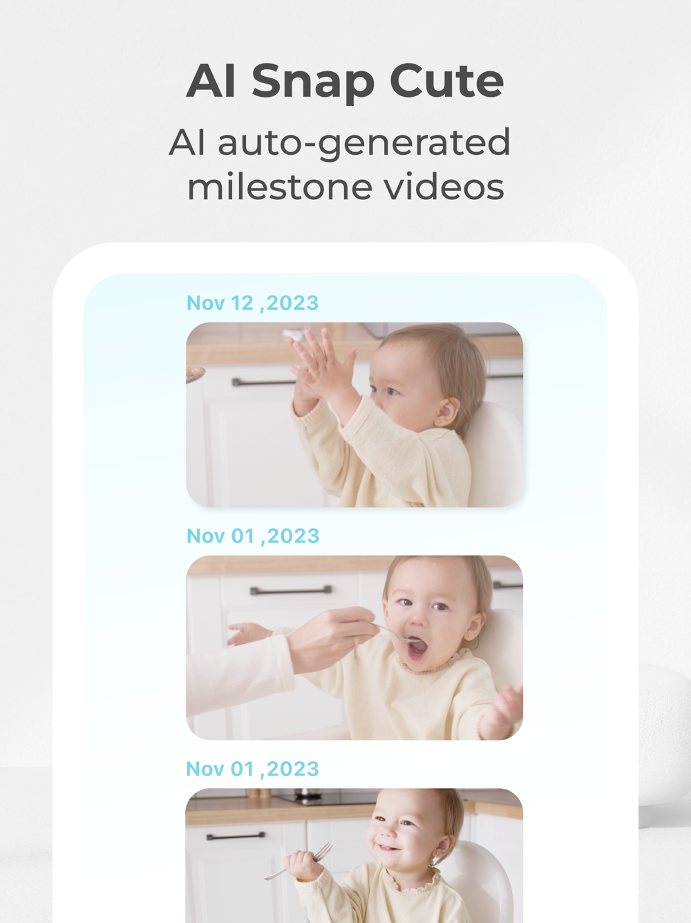 AI Snap Cute is a game-changer, automatically capturing heartwarming playtime videos of your baby and family members, transforming them into amazing family videos.