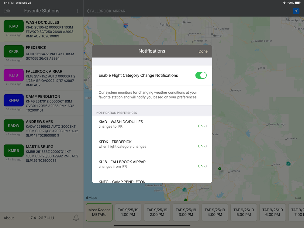 Unique to this app is a robust alerting system, which monitors changing flight categories and notifies you based on alert conditions you choose. For example, if you want to know when your departure airport turns from IFR to VFR, tap a few settings, and you'll get an alert when the change occurs.
